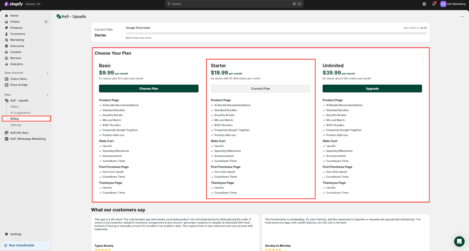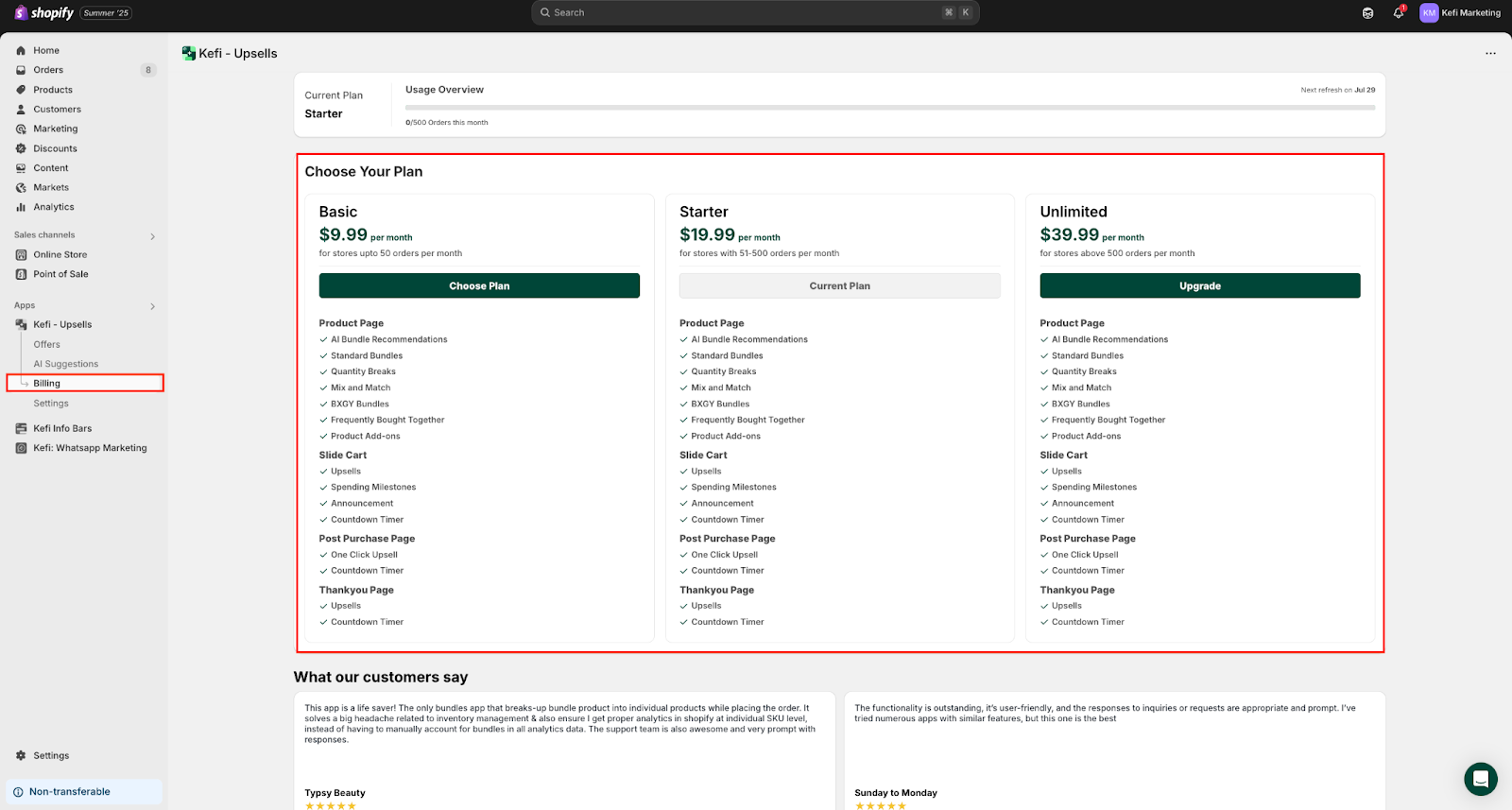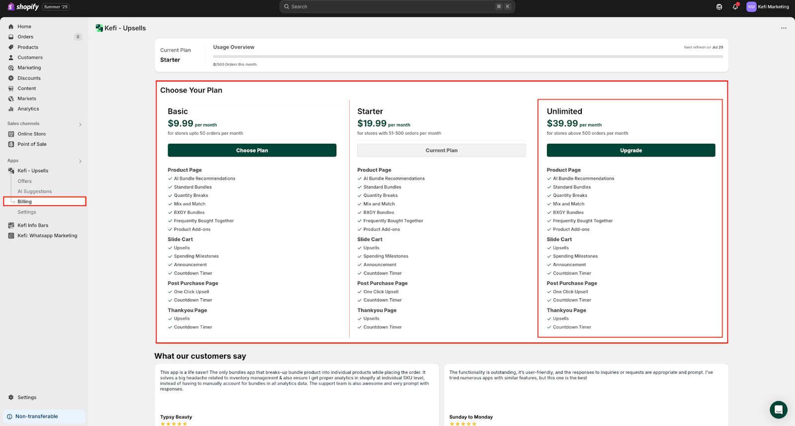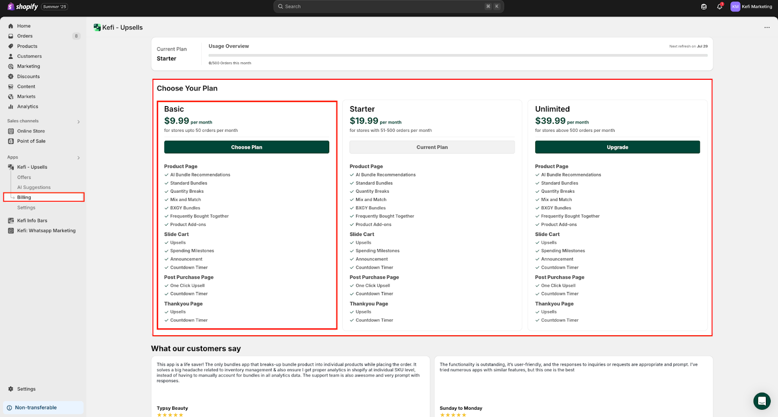 If you're just starting out or testing the app, the Basic Plan is a great way to explore its capabilities. As your order volume increases, you can easily upgrade to the Starter or Unlimited plan directly from the Billing tab within the app — no complicated transitions or setup required. Simply click on ‘Choose Plan’/Upgrade and make the payment.