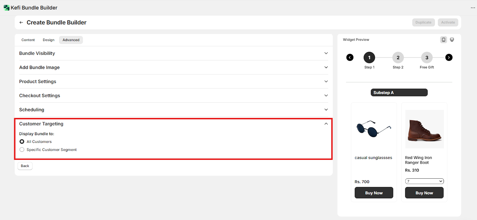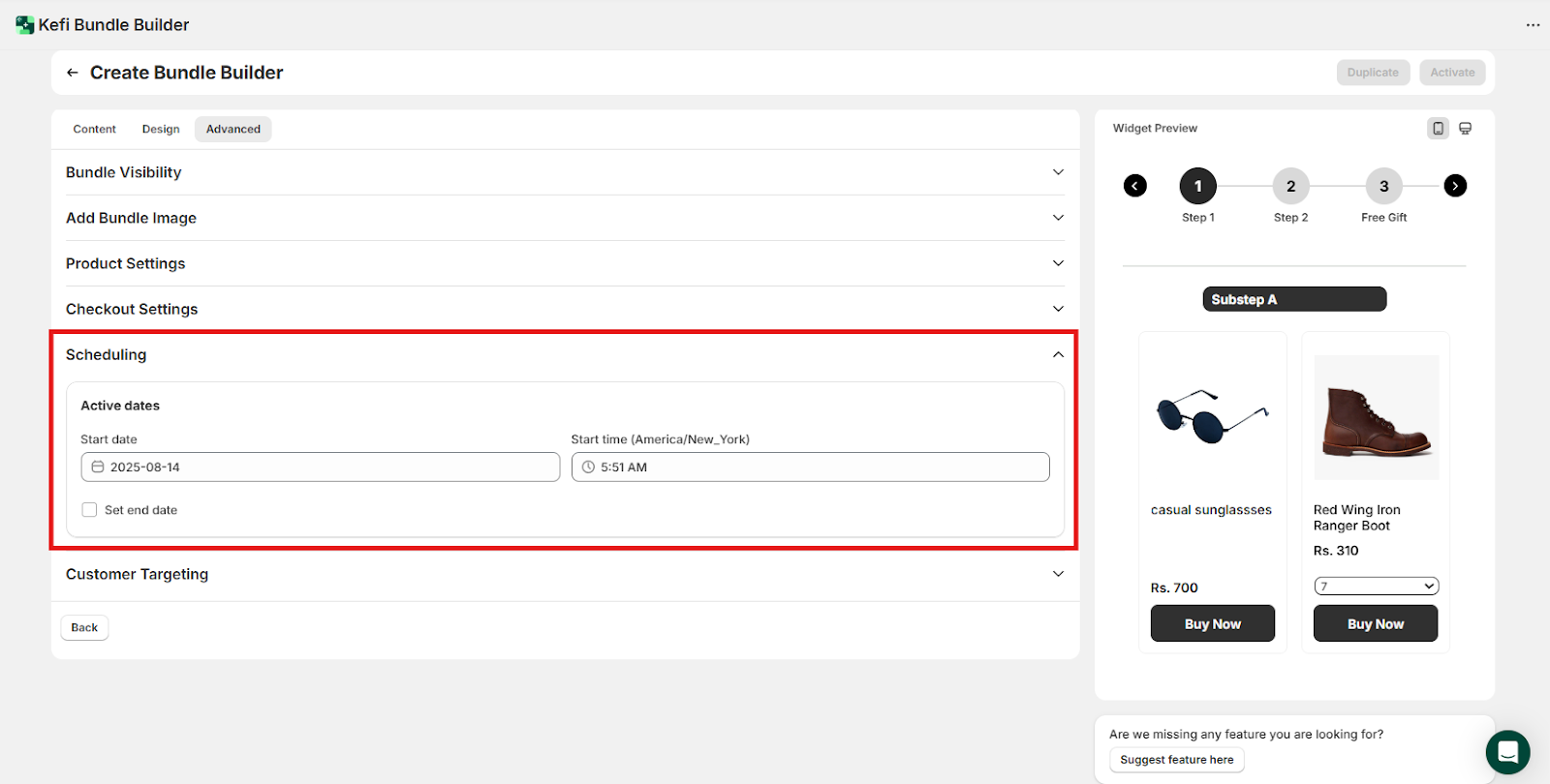 The Advanced tab gives you powerful tools to manage how, when, and to whom your bundle is shown. This includes settings for bundle visibility, scheduling promotions, and targeting specific customer groups.