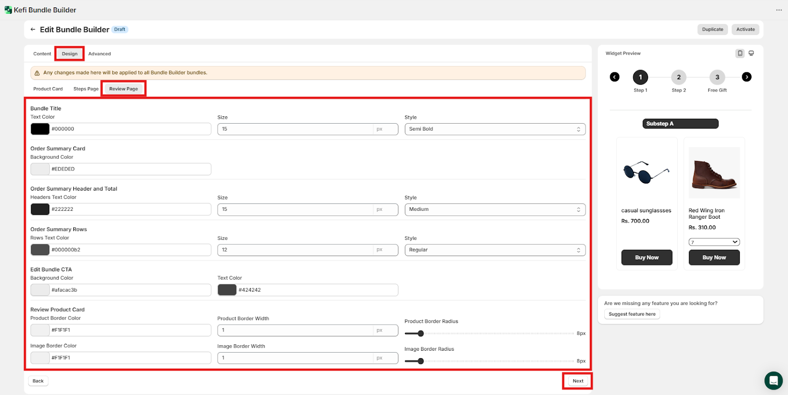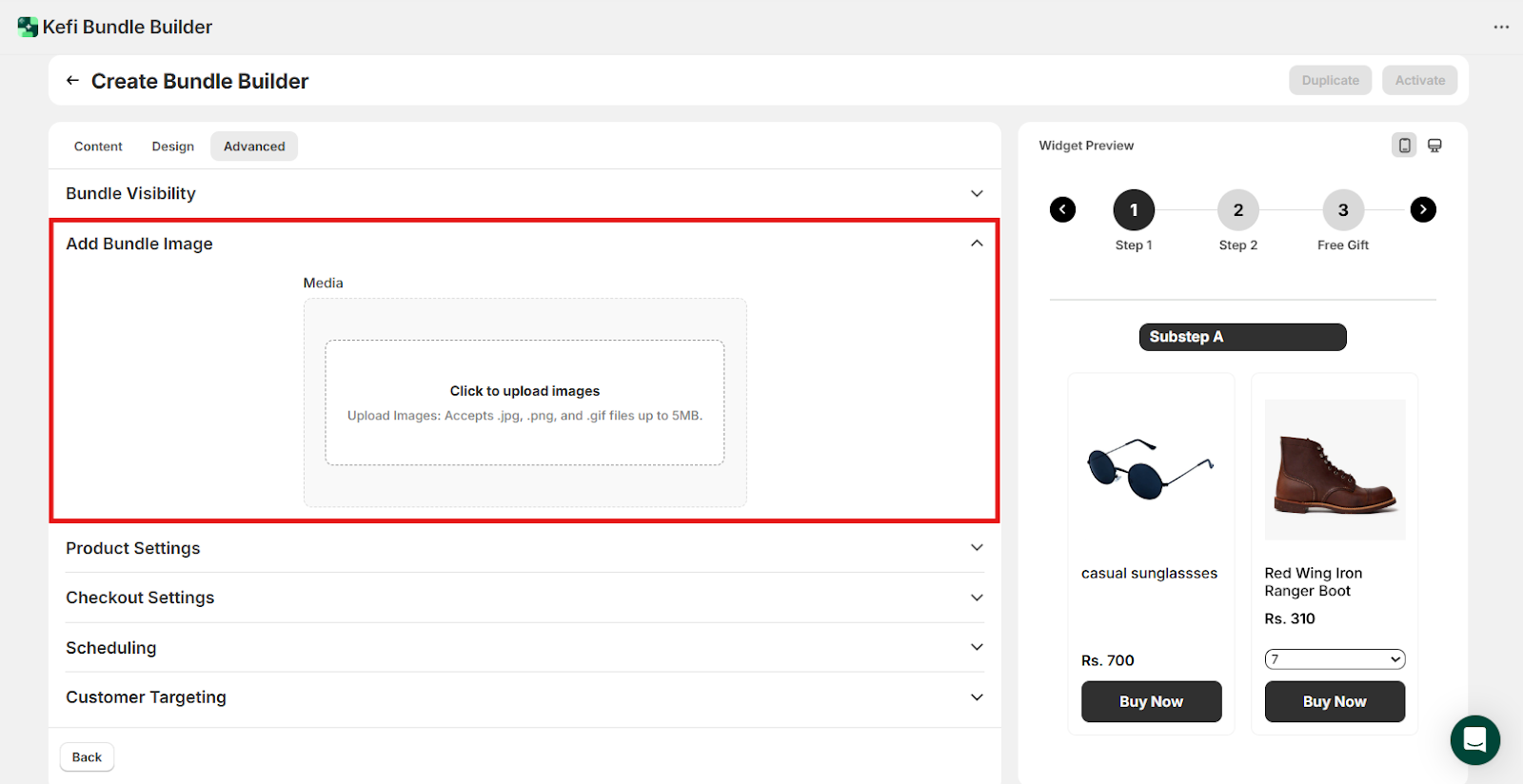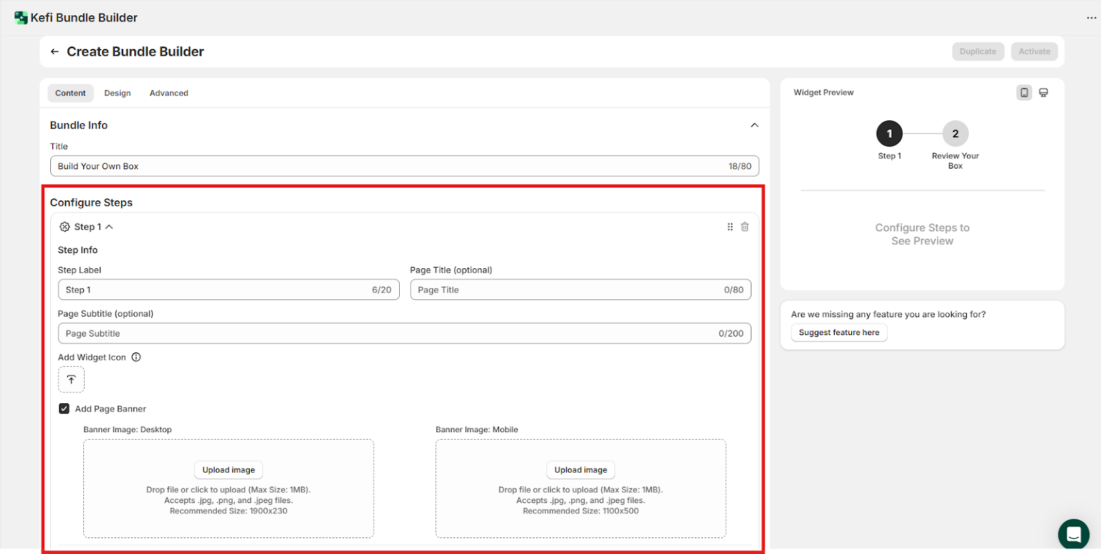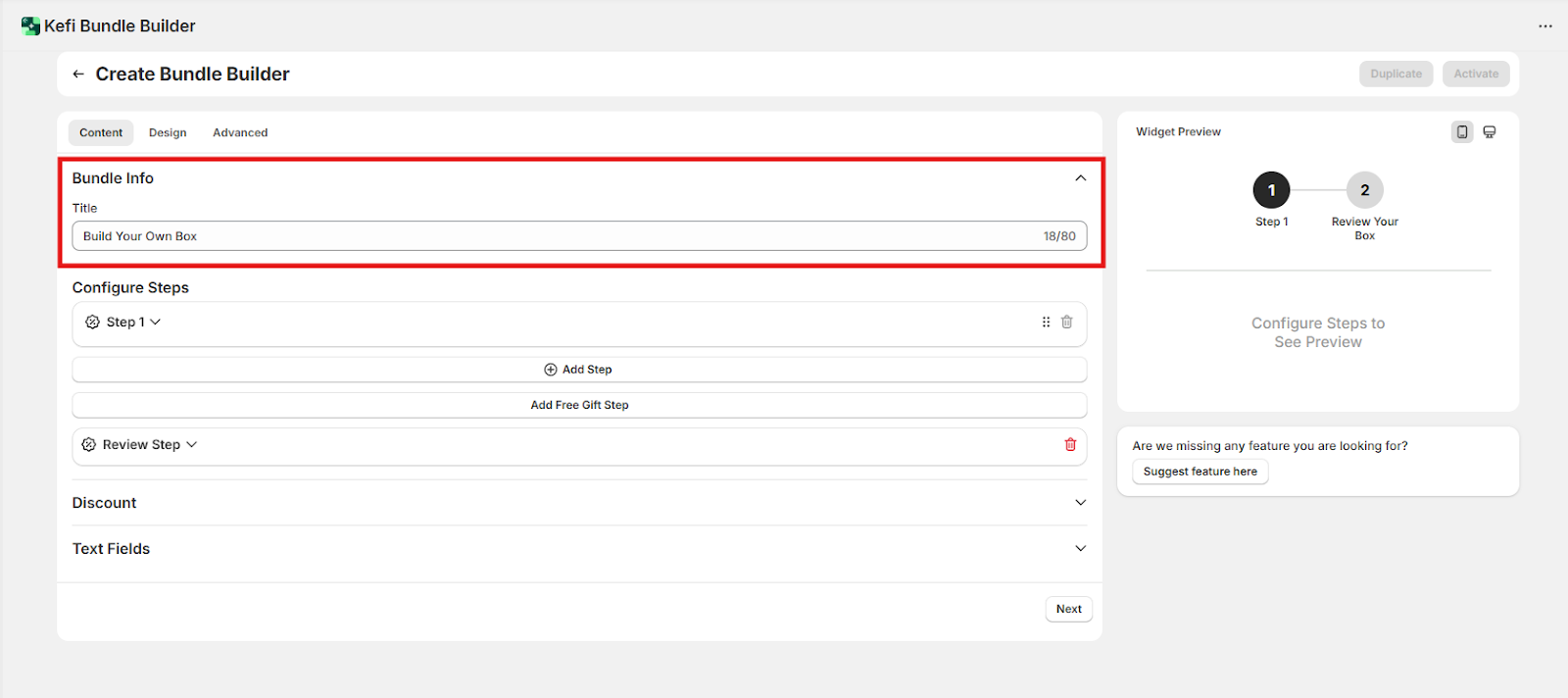 Content – Add bundle info, configure steps, set discounts, and customize text fields.