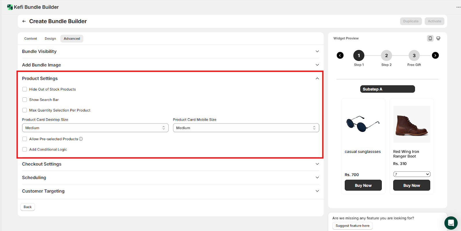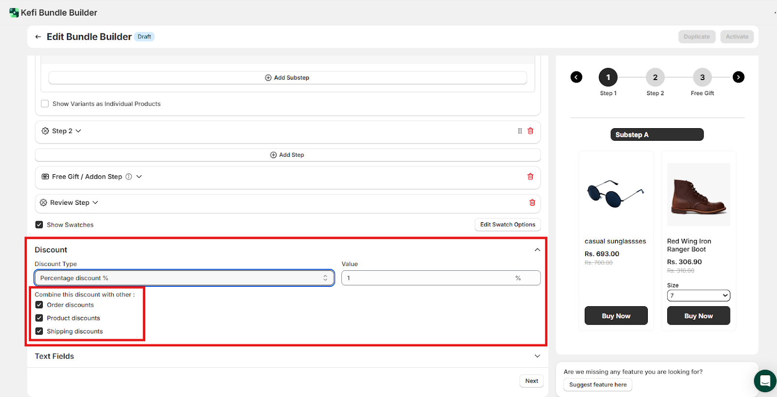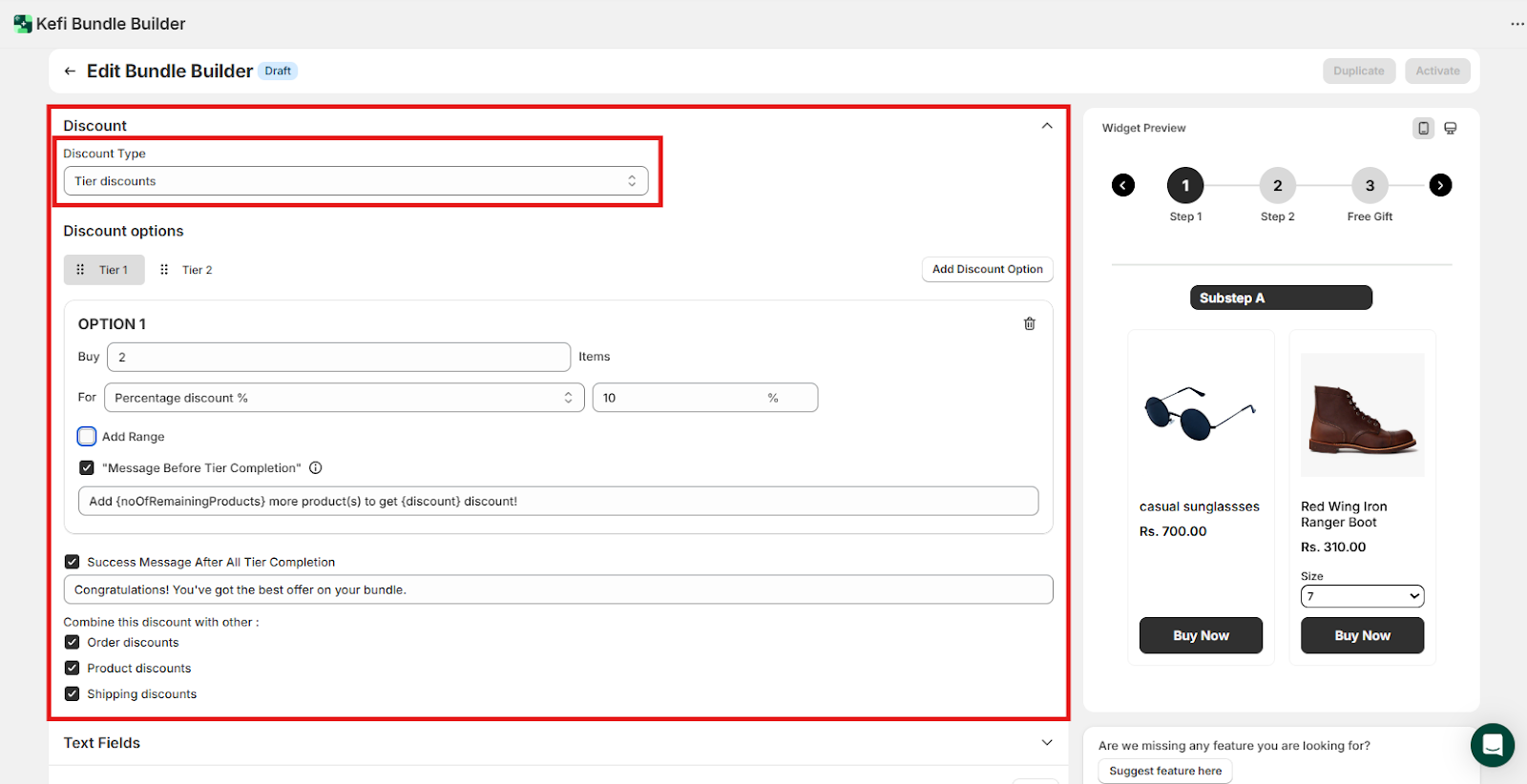 Content – Add bundle info, configure steps, set discounts, and customize text fields.
