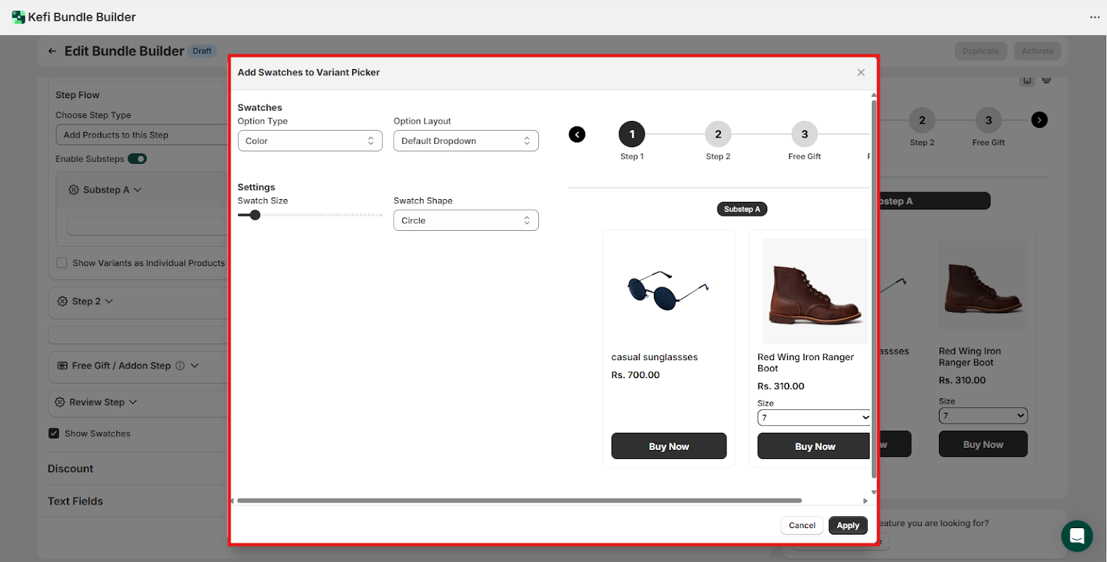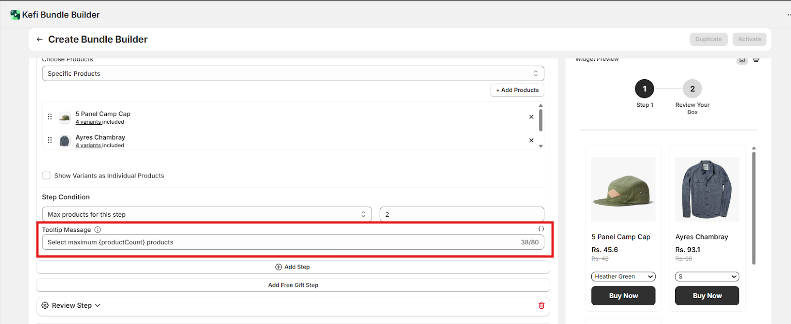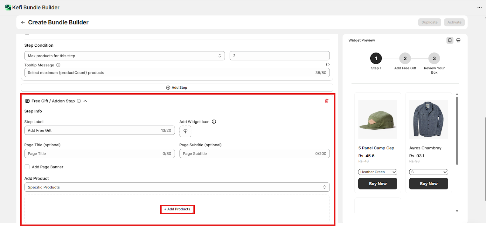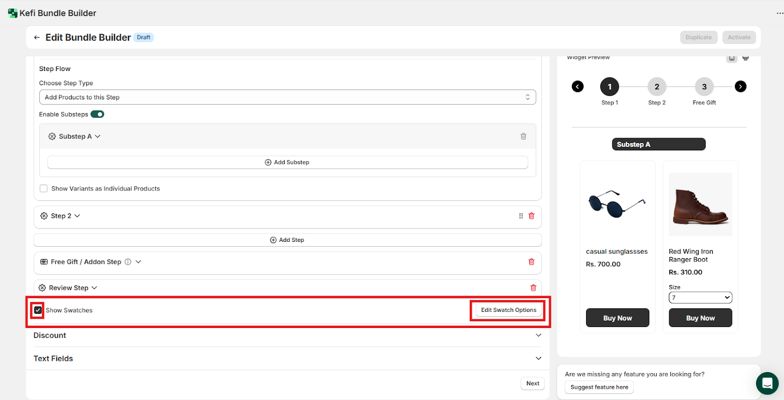 Content – Add bundle info, configure steps, set discounts, and customize text fields.