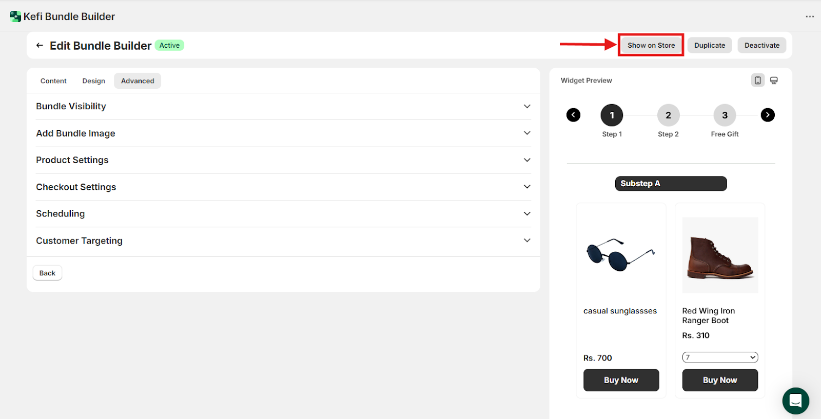 After activating your bundle, you can click Show on Store to preview how the bundle appears live on your storefront.