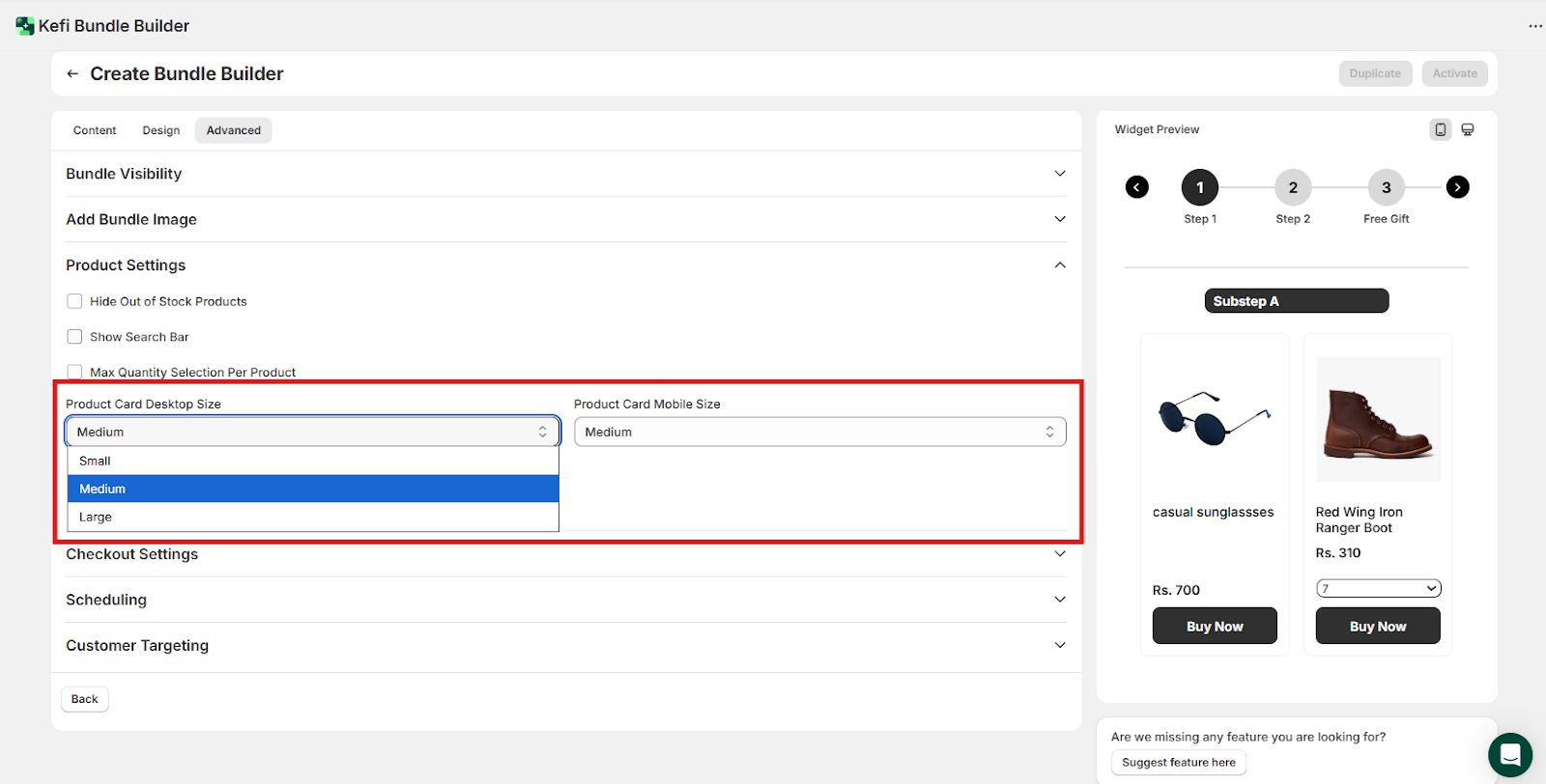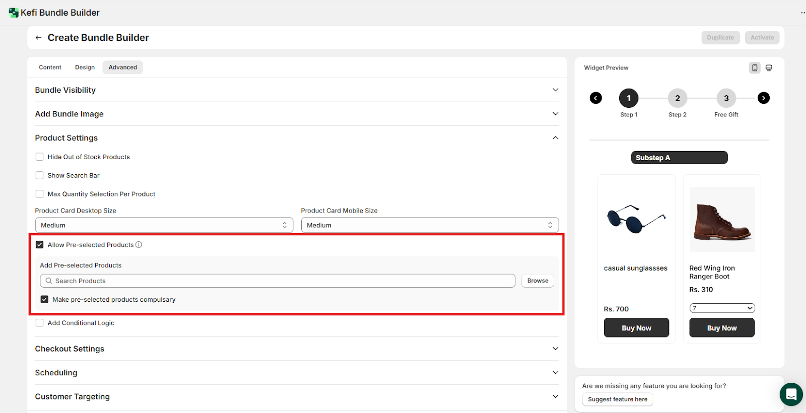 Advanced – Manage bundle visibility, upload bundle images, set scheduling, and apply customer targeting rules.