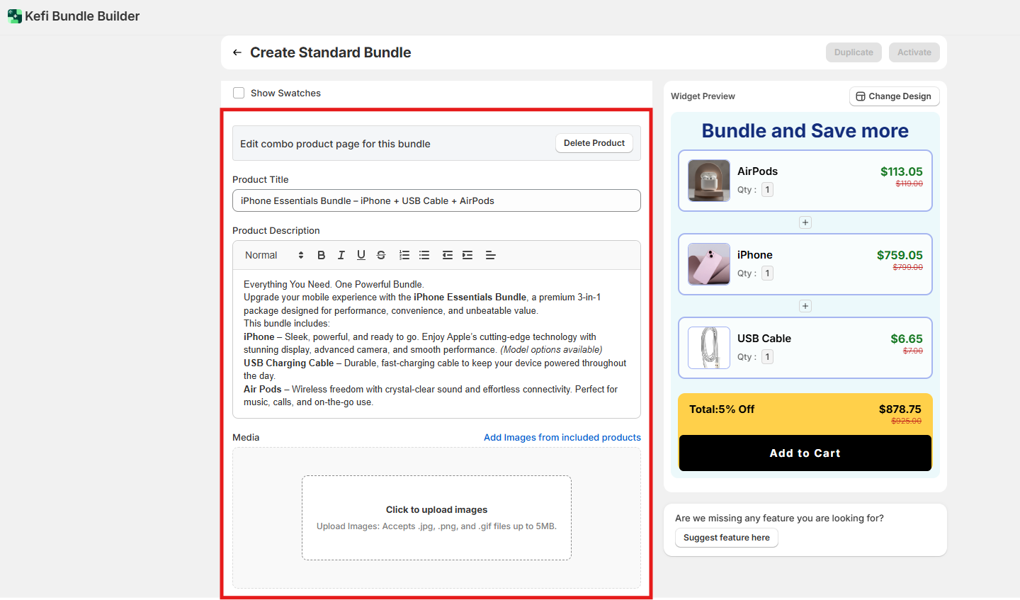 • Media Upload – Upload an image or graphic to visually represent your bundle on the product page.