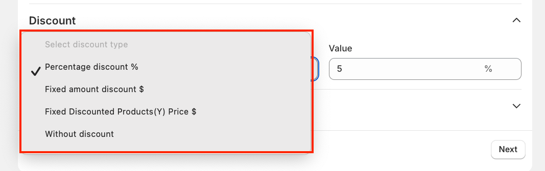 When setting up a BXGY offer, you’ll be able to choose from the following discount types for the Y (discounted) product: