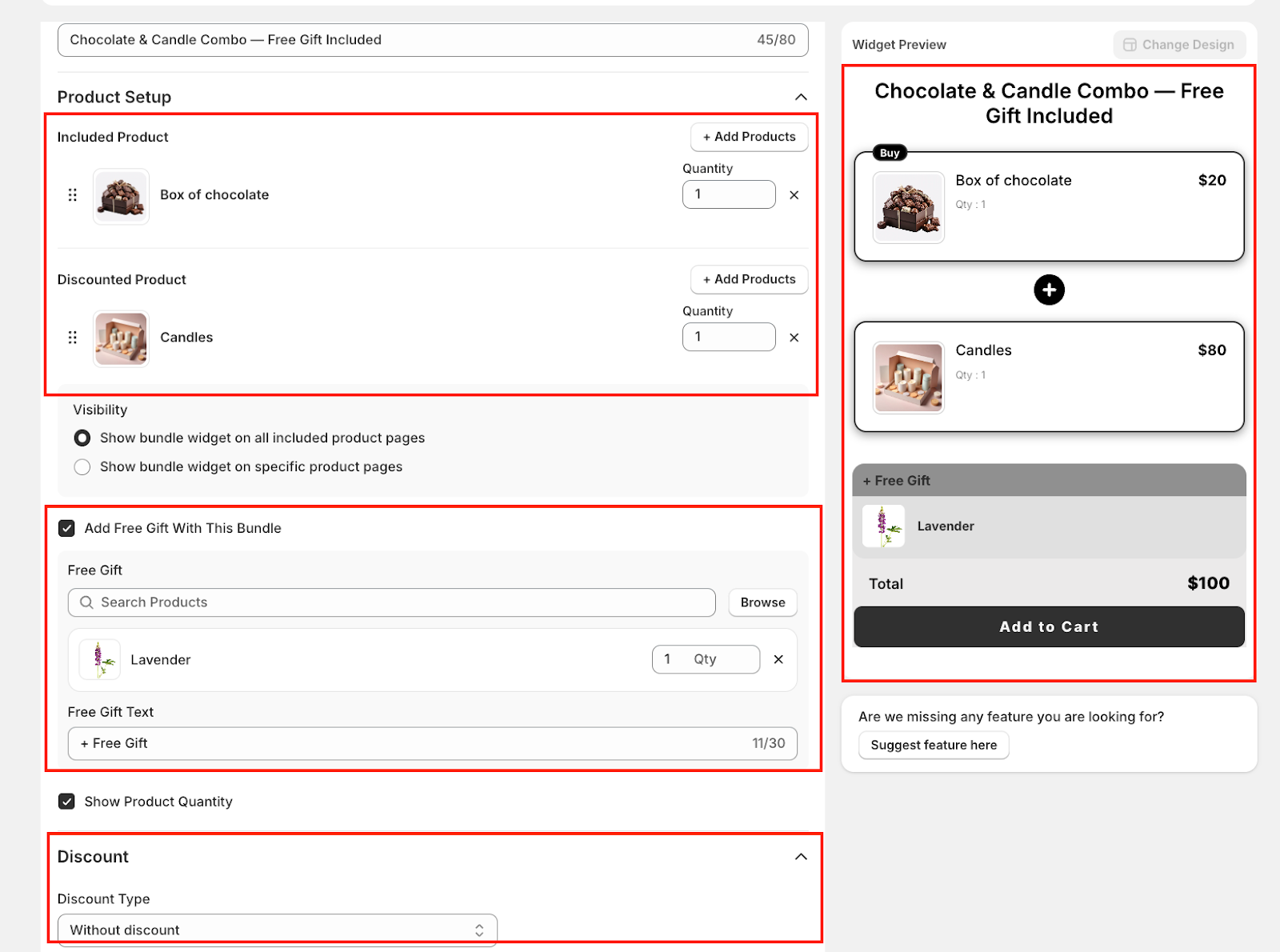 Offer Example: When a customer purchases 1 Box of Chocolate and 1 set of Candles (no price discount applied), they receive a Lavender item as a free gift. The bundle retains full product pricing but delivers added value through the complimentary item.