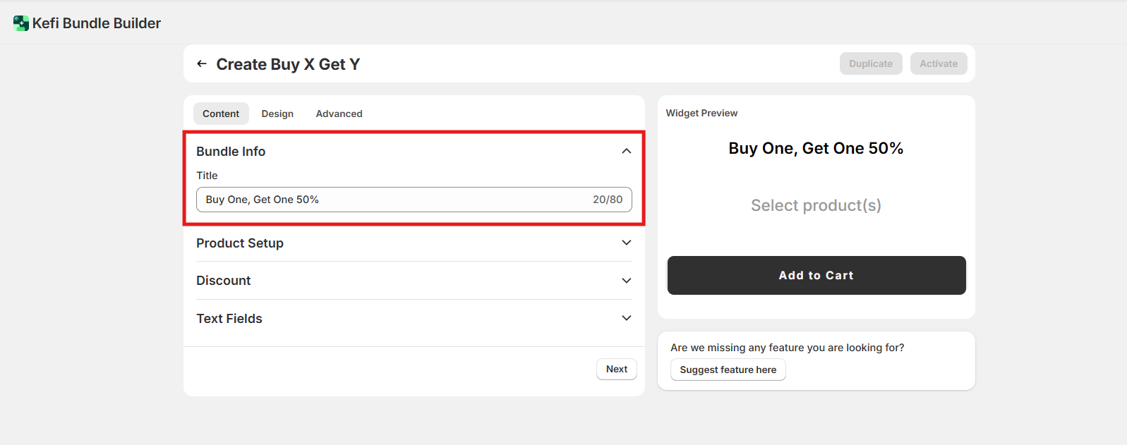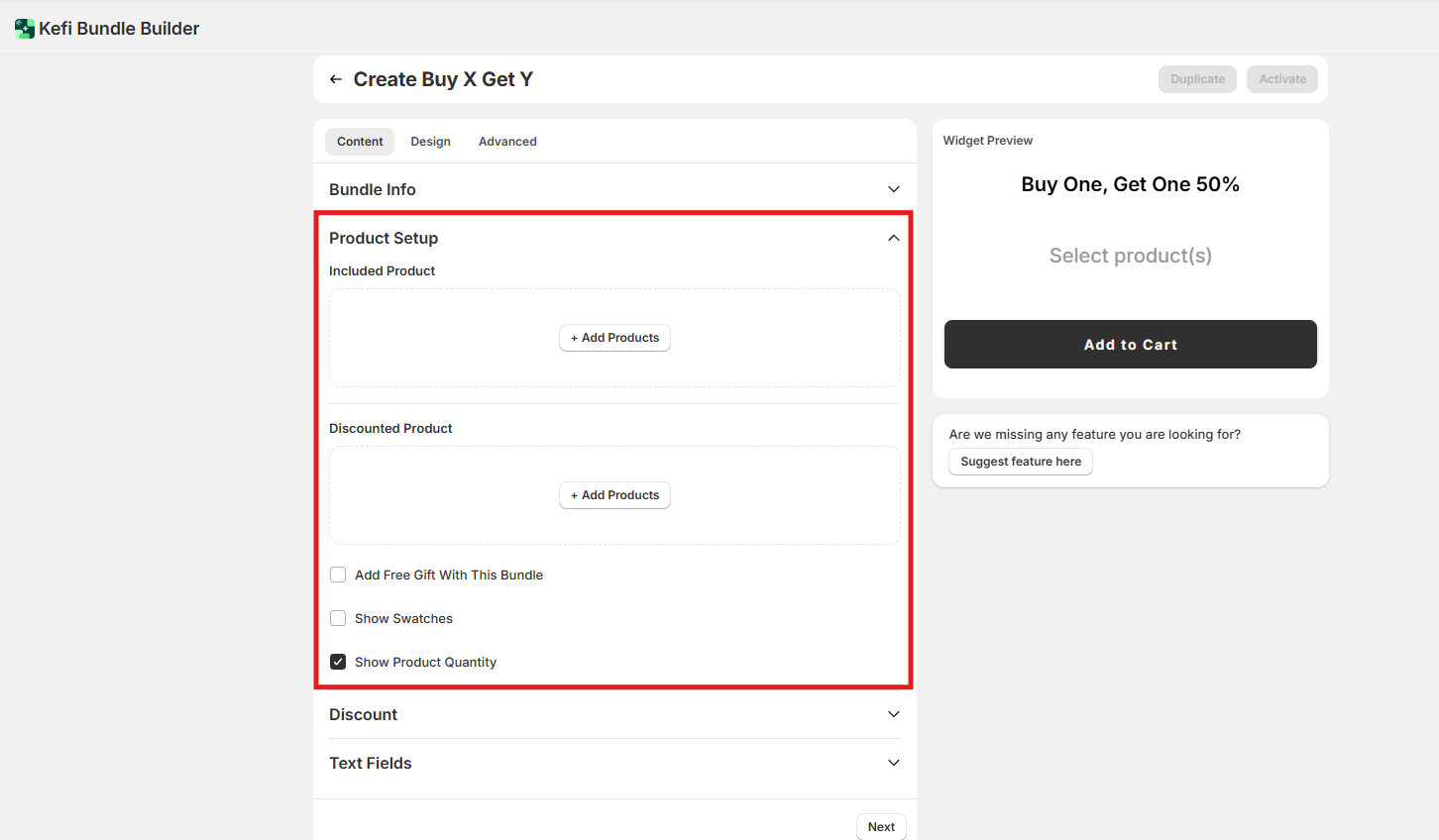 After selecting BXGY Bundle, you'll be redirected to the Content Section, where you can set up your bundle. This section includes: