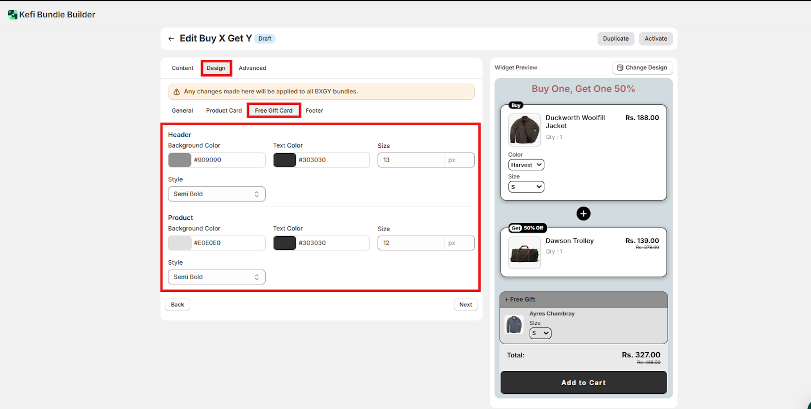 The Design section allows you to fully customize the look and feel of your bundle widget, ensuring it aligns perfectly with your store’s branding and layout. From background colors and typography to product cards and buttons, you have complete control over the visual presentation of your bundles.