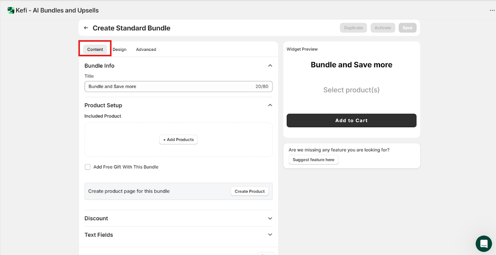 After completing the initial setup in the Content section—including Bundle Info, Product Setup, and Discounts—you'll find the