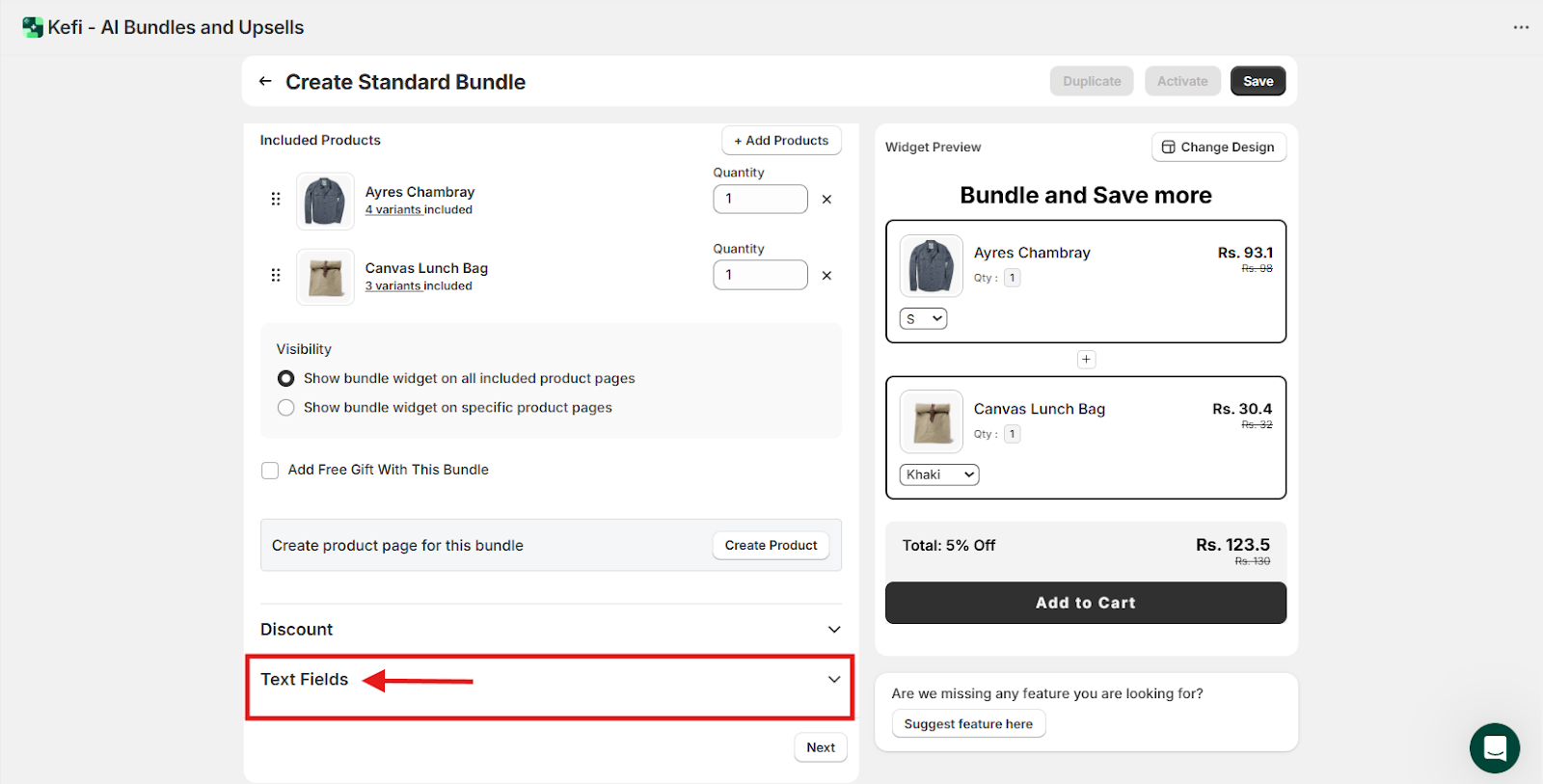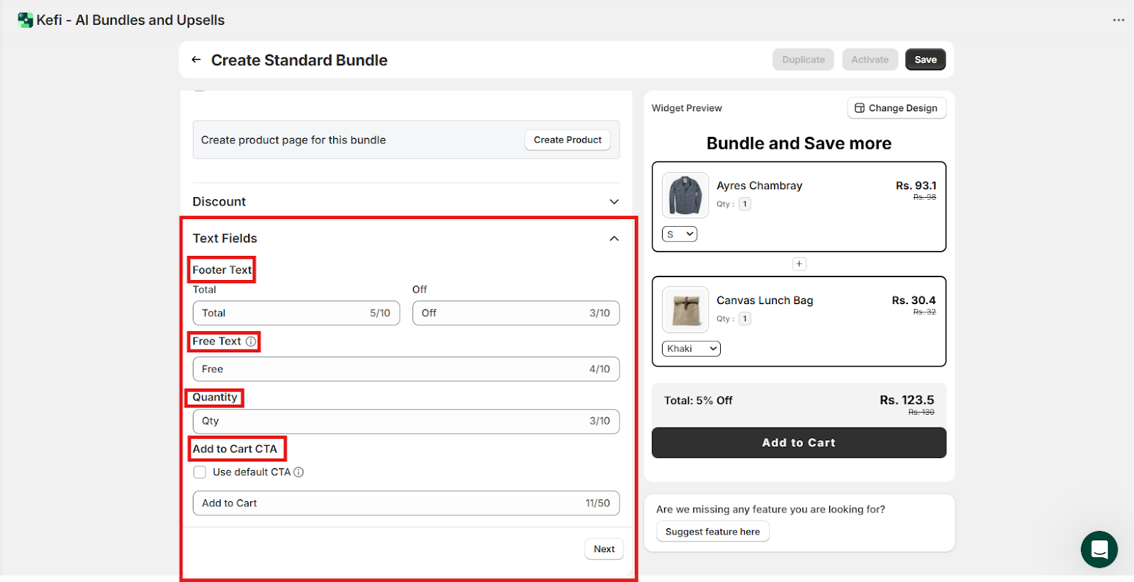 In the Text Fields section, you’ll have the option to change the text for various elements—such as Footer Text, Free Text, Quantity, and the Add to Cart call-to-action (CTA)—into your preferred language.