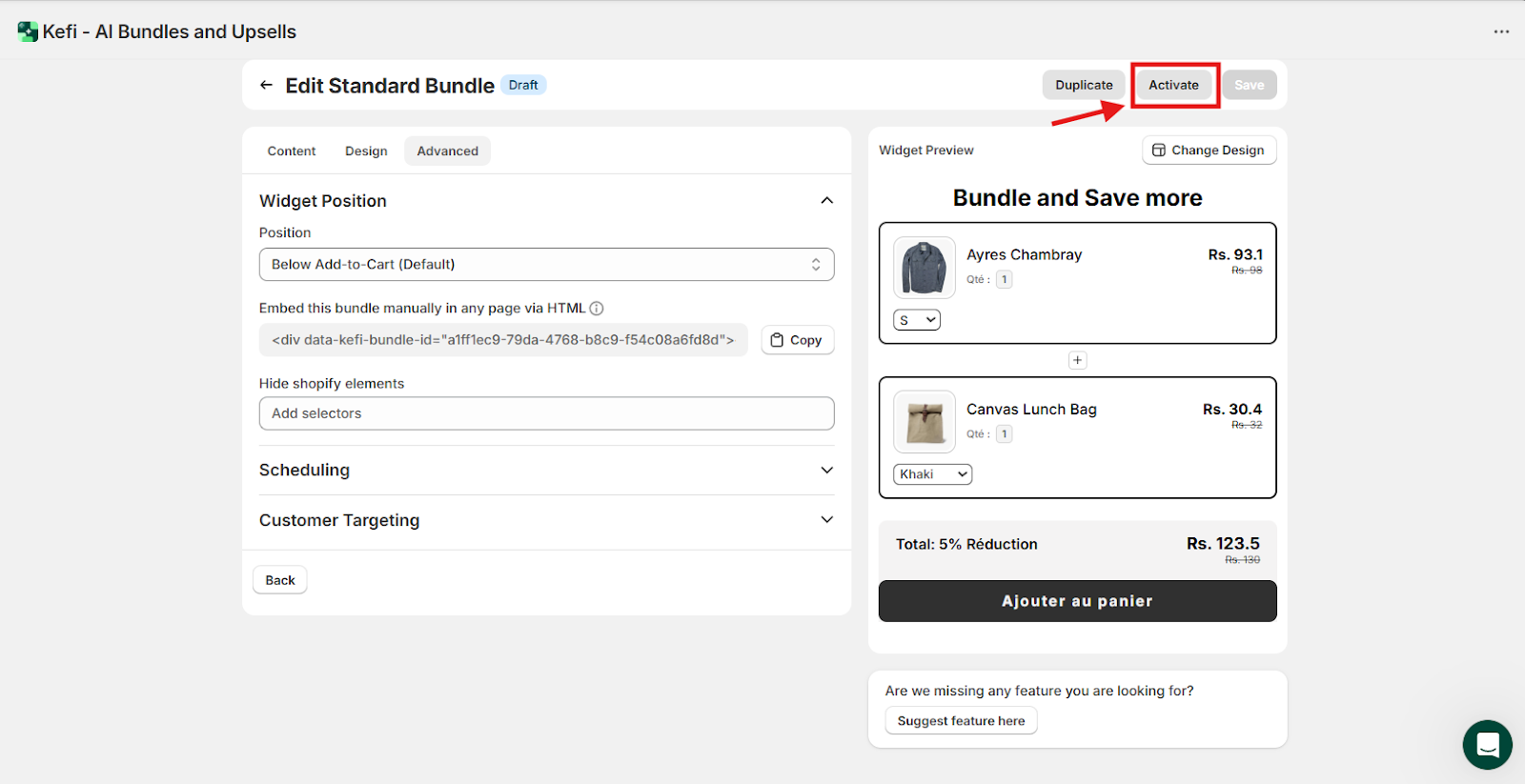 Click on “Activate” to activate the widget on your shopify store(make sure you have enabled the core snippet button in order to see the bundles on your store).