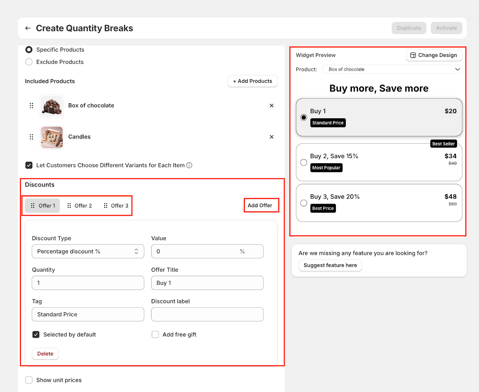 You can create multiple offers by clicking "Add Offer". Each offer can have: