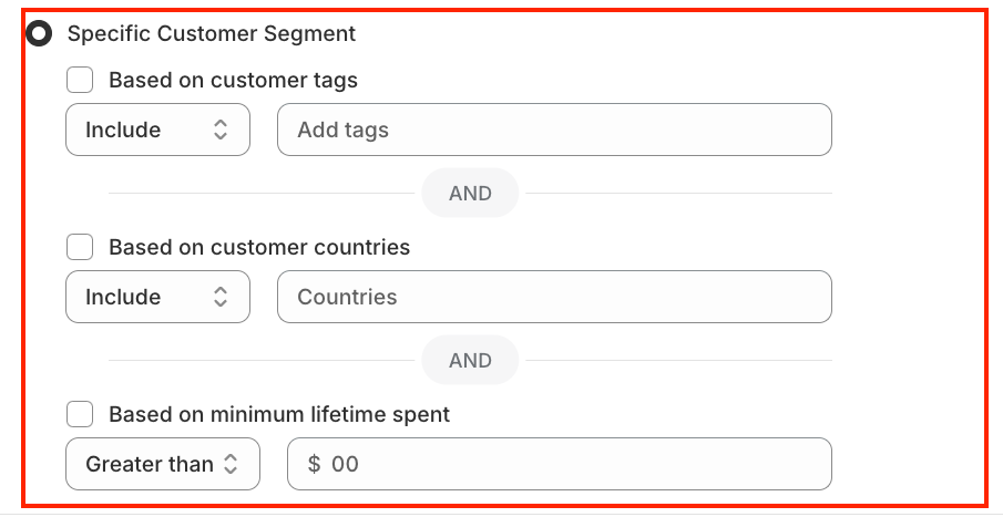 • Customer Tags - Show the offer only to customers with certain tags (e.g., VIP, Wholesale, Subscriber).