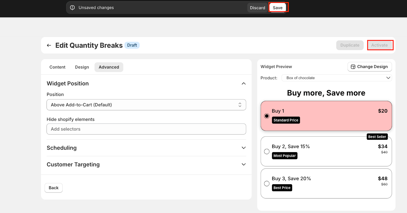 Once you've finished setting up your quantity breaks—customizing content, design, and advanced settings—it’s time to save and launch your offer.