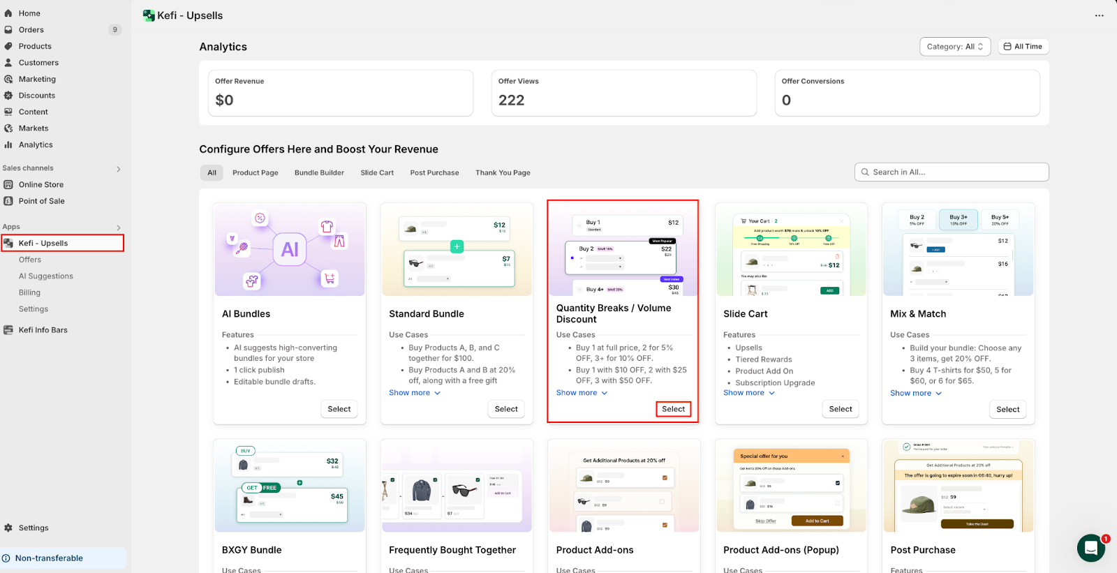 Navigate to the Kefi Bundles App in your Shopify Admin panel, and click on ‘Select’ available on the Quantity Breaks/Volume Discount Bundle) option.