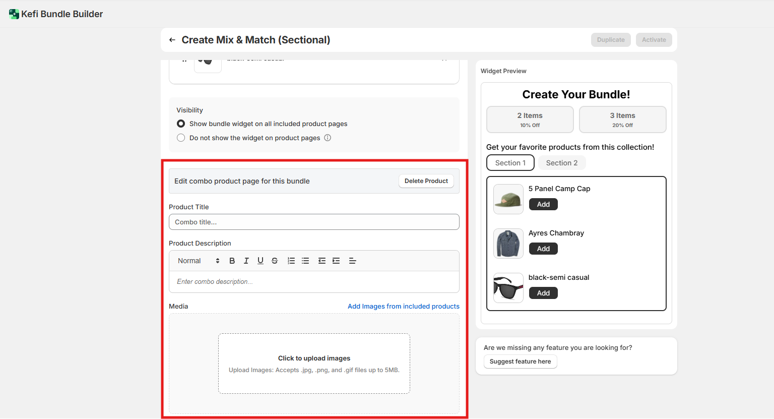 For this example, we chose the first visibility option, so the bundle widget will be visible on the product pages of the items included in Section 1. This helps increase visibility and discoverability of the bundle as customers browse those product pages.