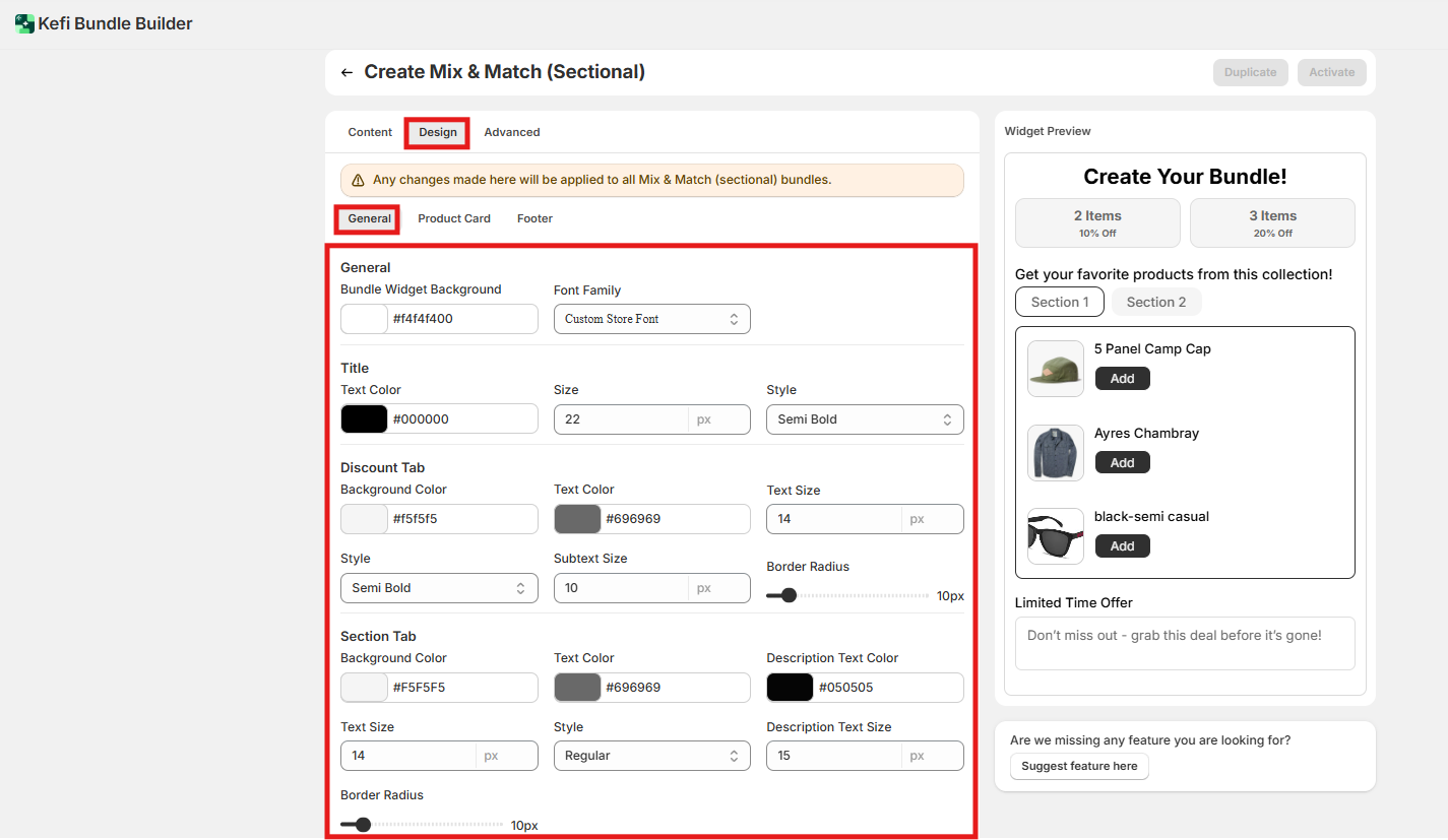 This section allows you to customize all the text shown on the Mix and Match (Sectional) bundle widget. It’s perfect for aligning the language with your brand tone or translating content for different markets.