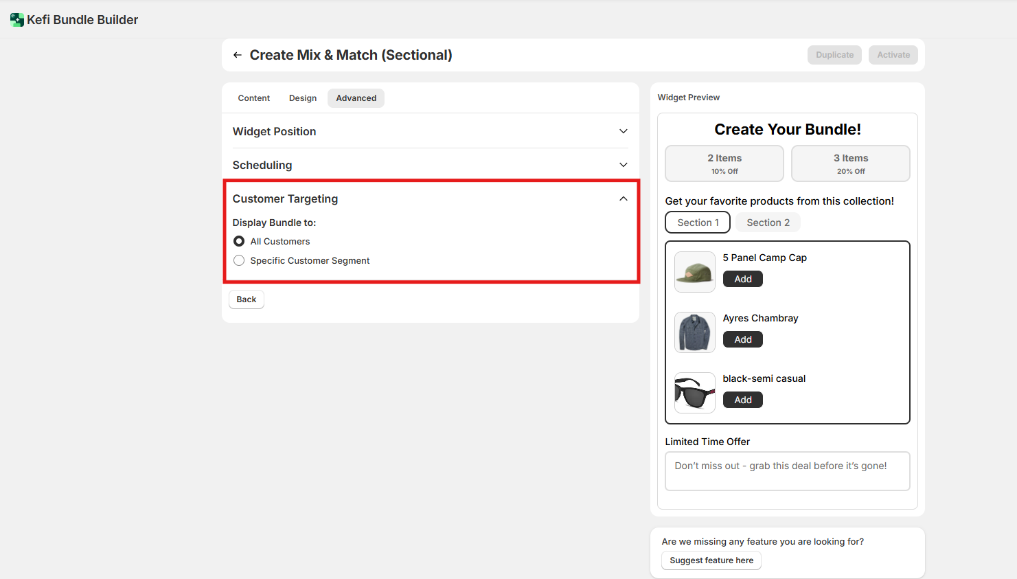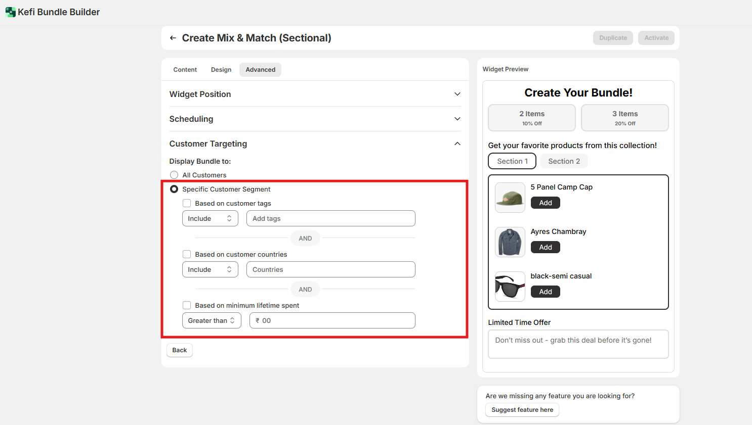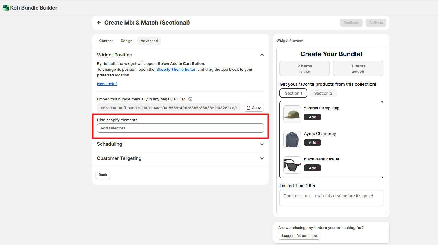 Advanced Settings - The Advanced section gives you greater control over when, where, and to whom the bundle widget is shown. These settings are useful for precise targeting and scheduling. Let’s dive into each option: