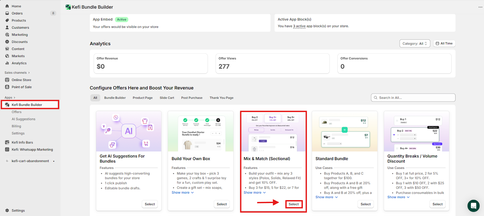 Go to the Kefi Bundle Builder homepage and select the Mix and Match (Sectional). Click “Select”
