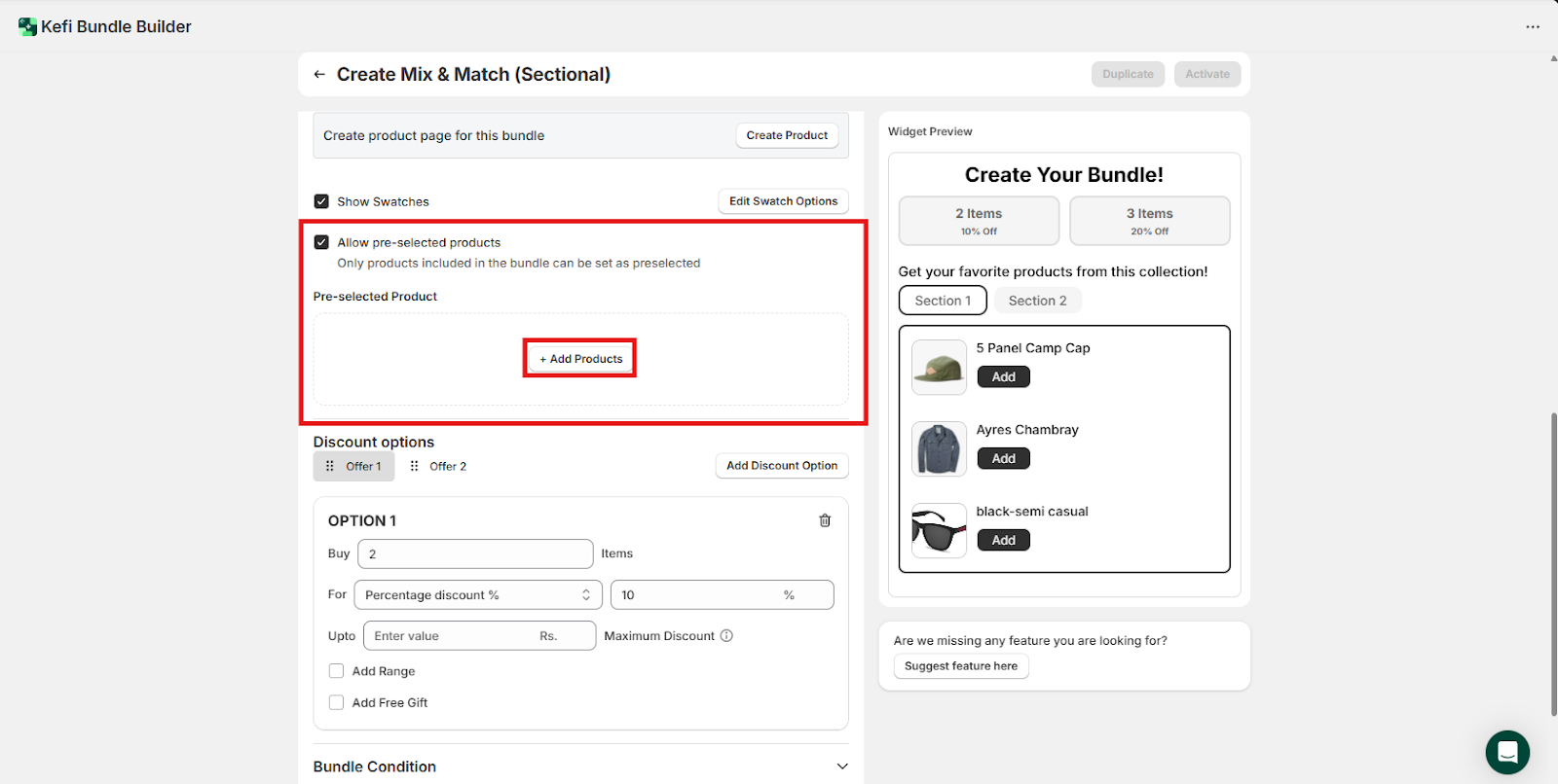 In Section 1, we selected the Specific Products option and manually added three different products to this section. This gives you full control over which individual items are available for selection.