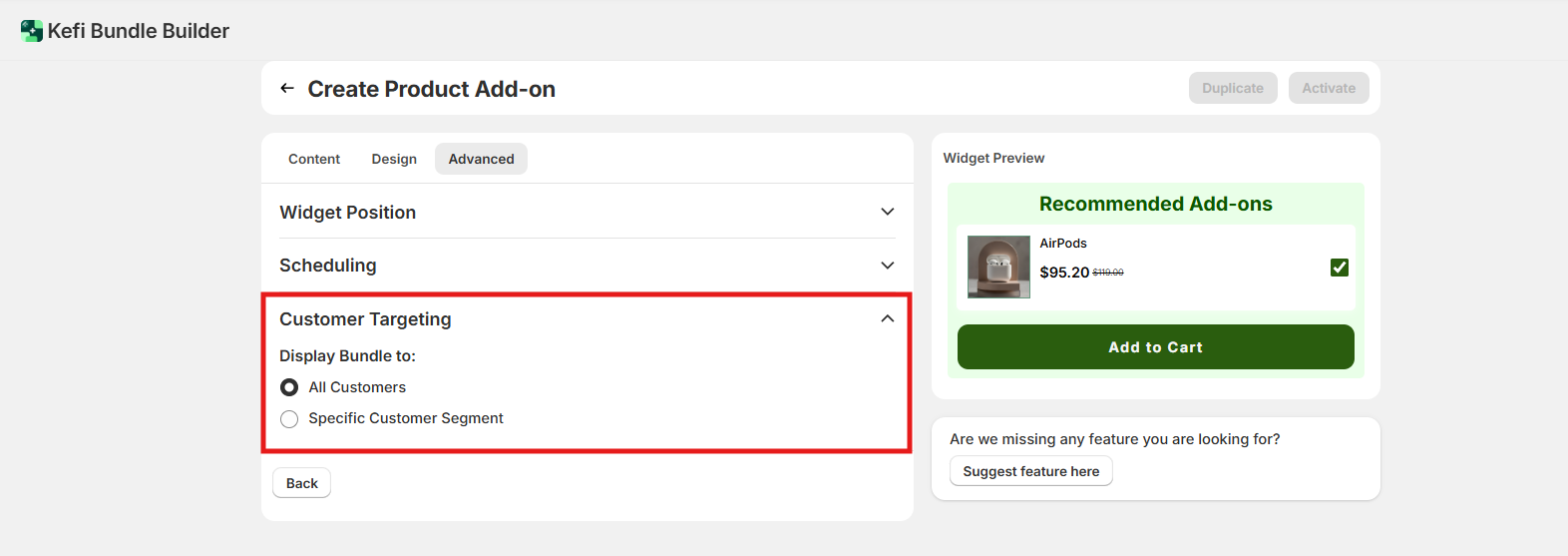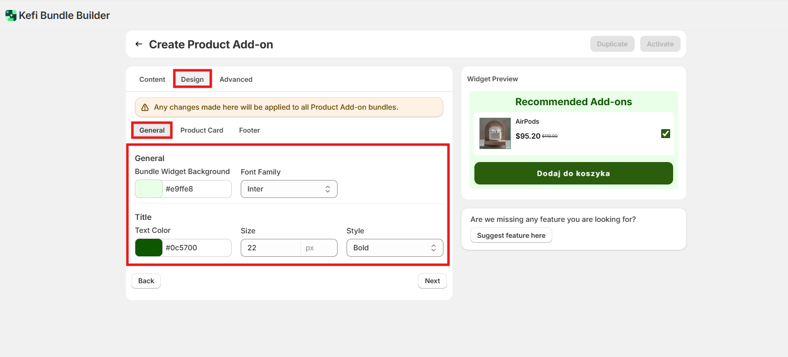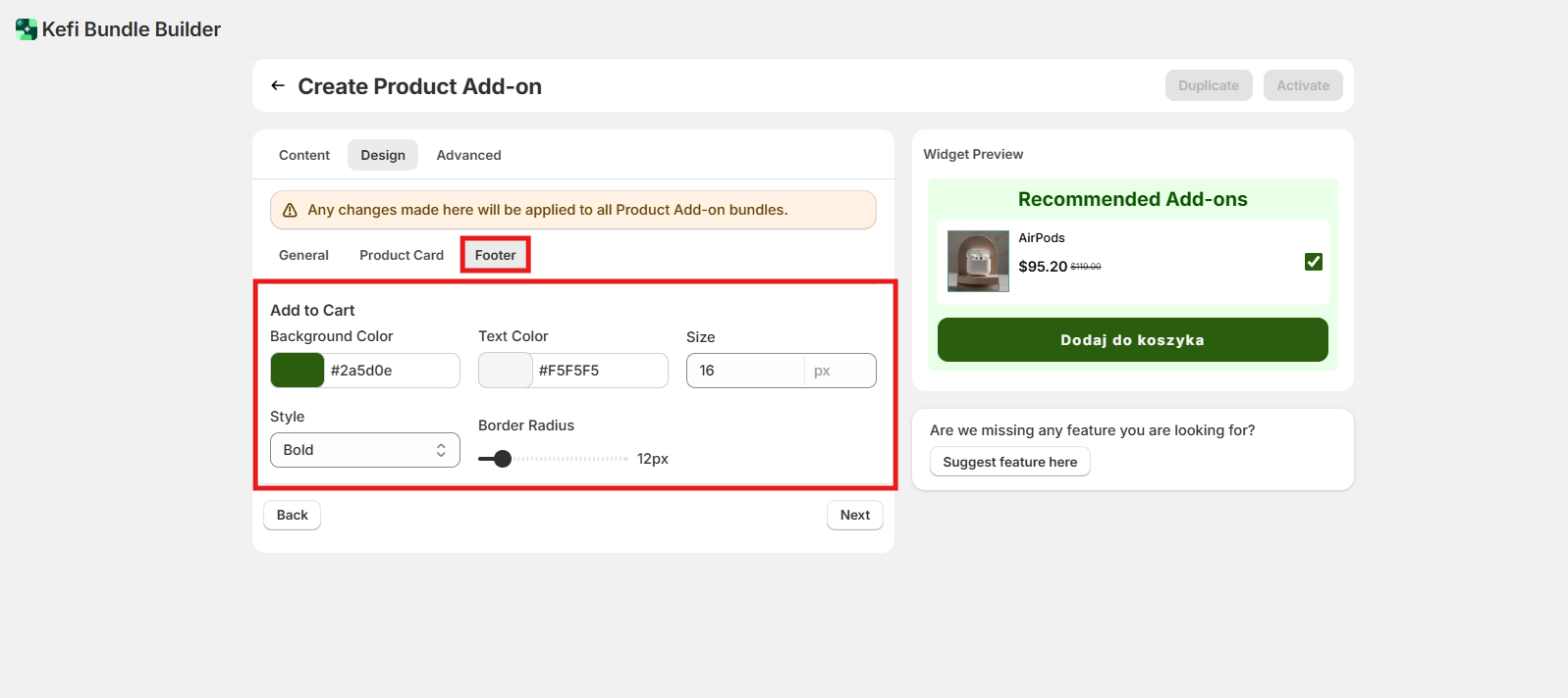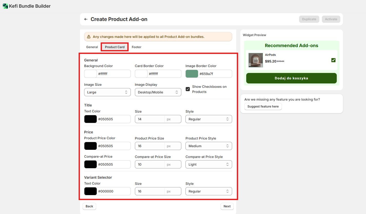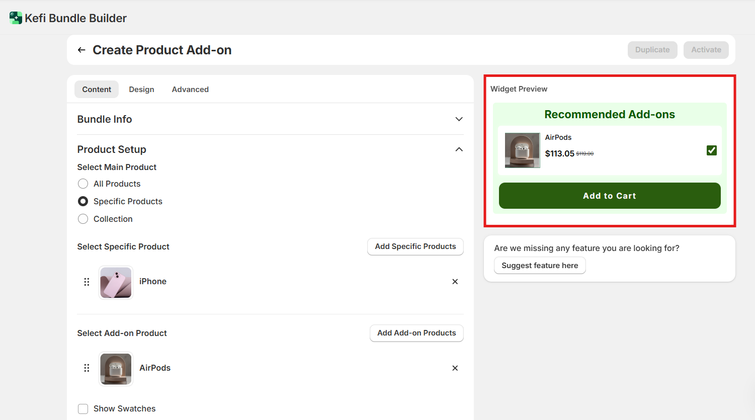 On the right side of the screen, you’ll see a live preview of the bundle widget. This preview updates in real-time as you configure your Product Add-on settings.