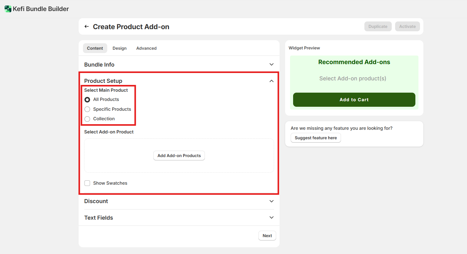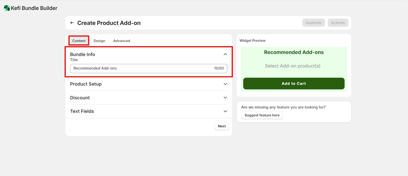 After you choose to create a Product Add-on, you'll be redirected to the Content section. This area is divided into four key sub-sections that help you customize how your bundle looks and works on your store: