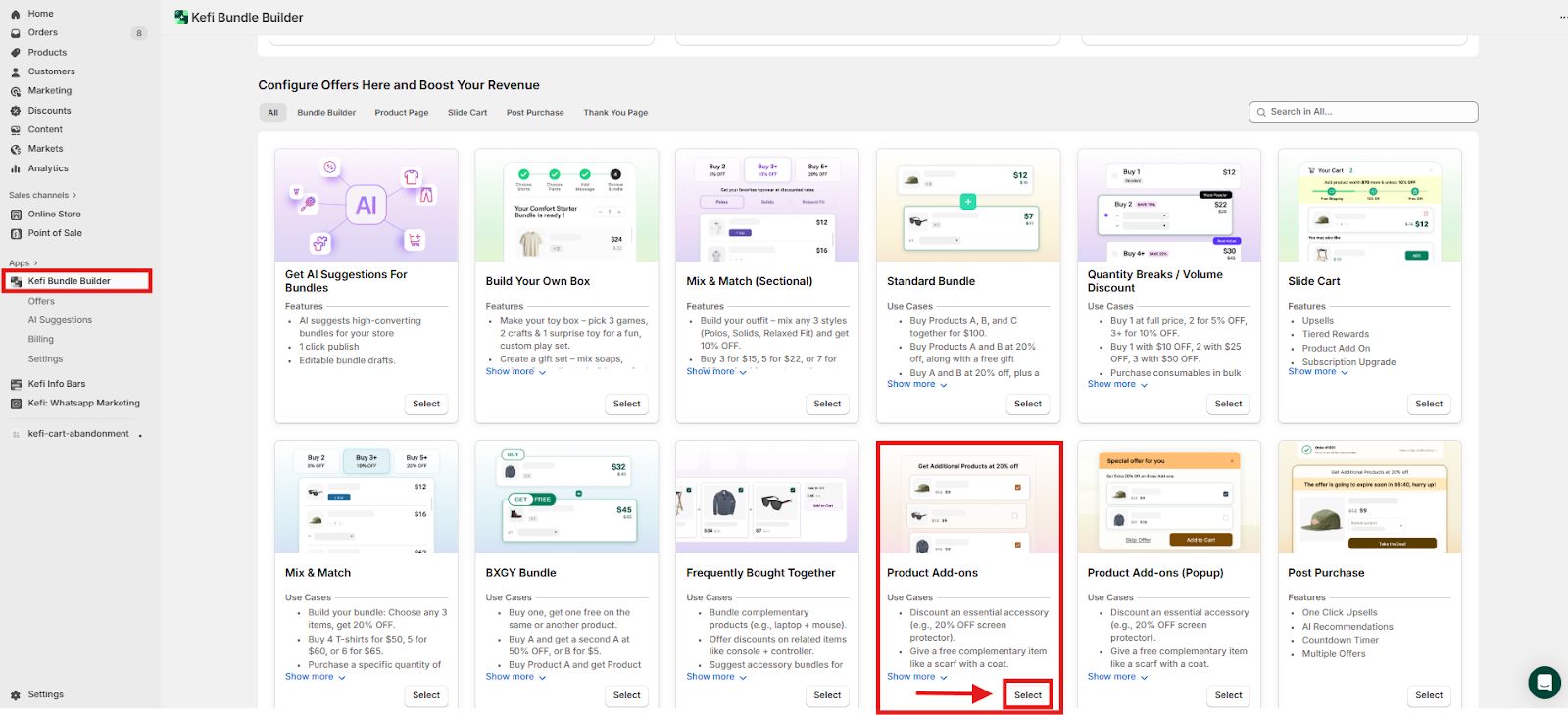 Go to the Kefi Bundle Builder homepage and select the Product Add-ons. Click “Select”