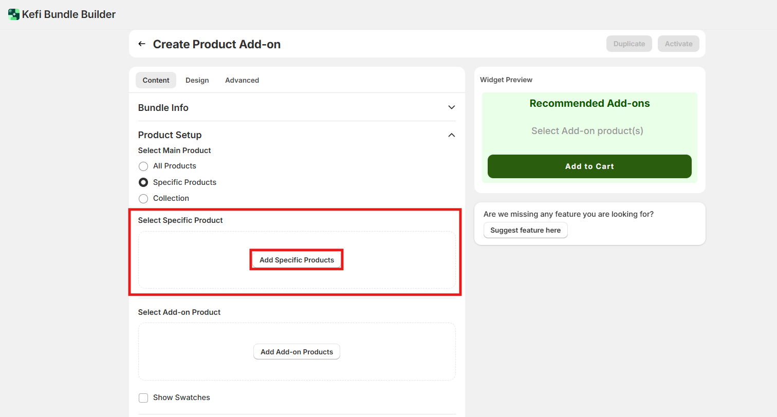 Once you select the product category-for example, Specific Products-you'll then be prompted to choose the Add-on Product you want to offer alongside those items. This is the product that will be shown as an optional add-on in the bundle widget.