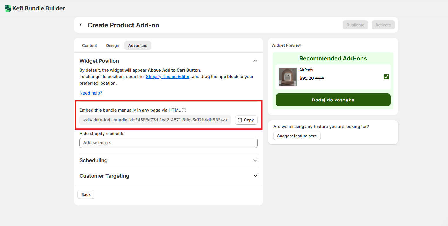 Click on “Activate” to activate the widget on your shopify store(make sure you have enabled the core snippet button in order to see the bundles on your store).