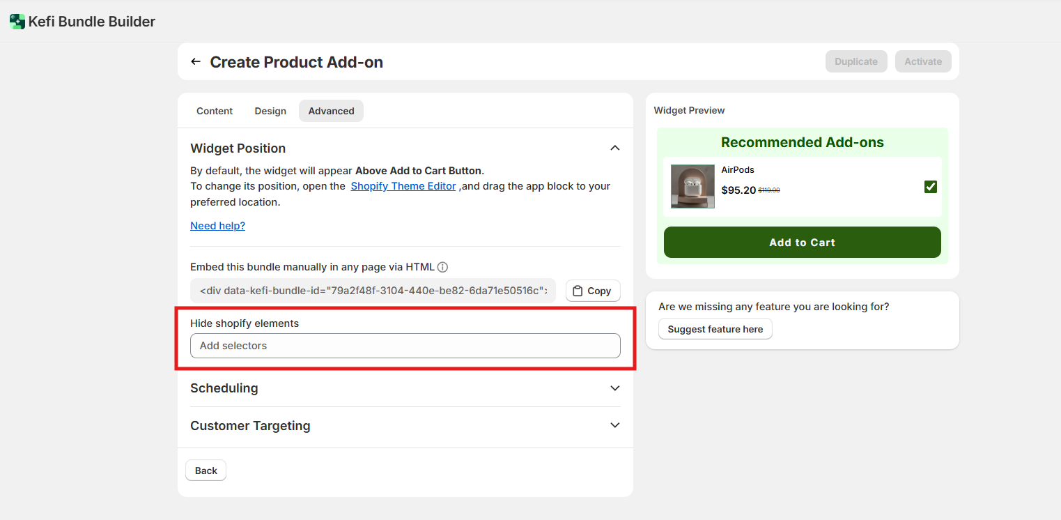 You have the option to hide specific Shopify elements (like the default Add to Cart button or product price) to reduce redundancy when showing bundles.