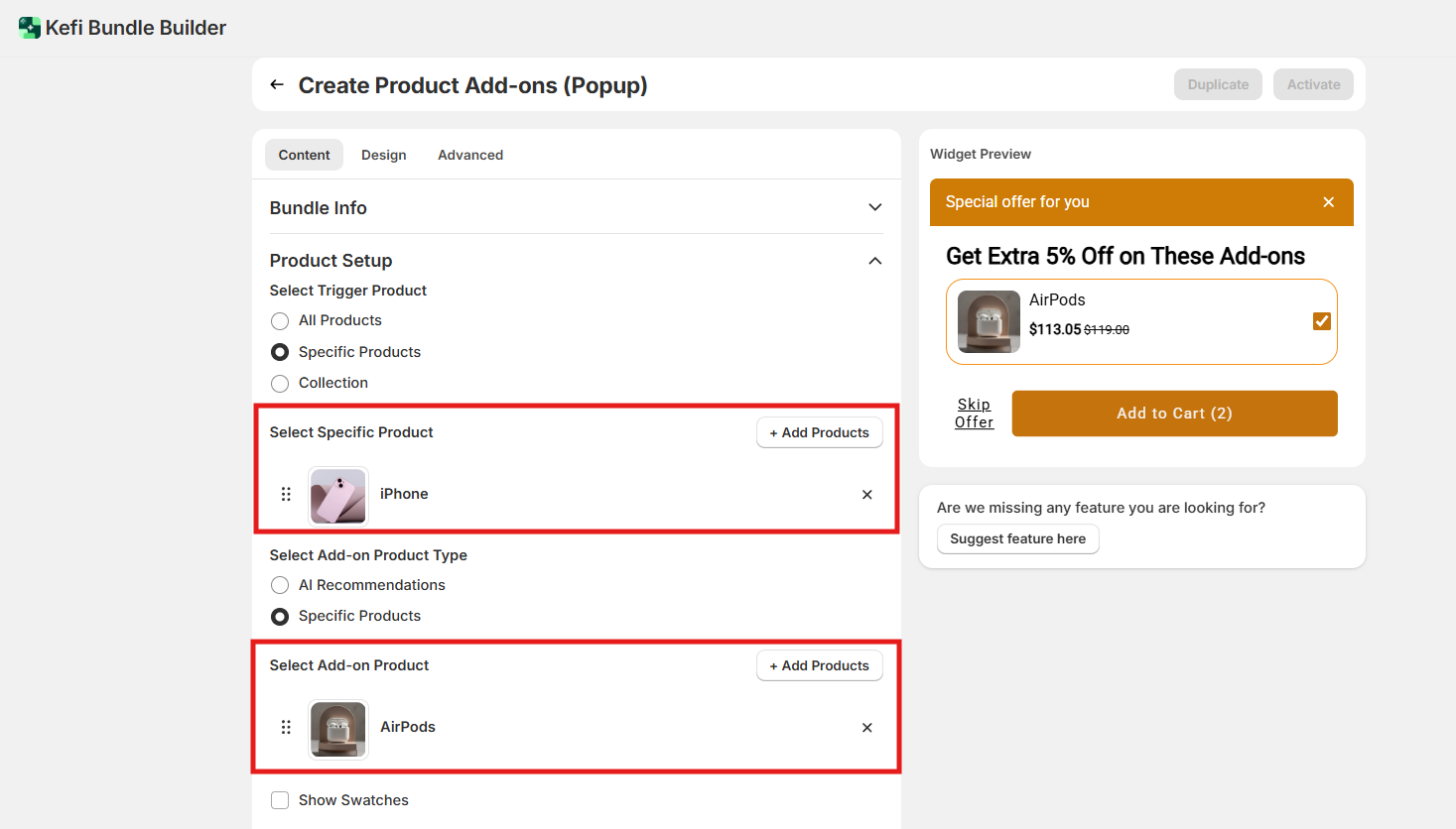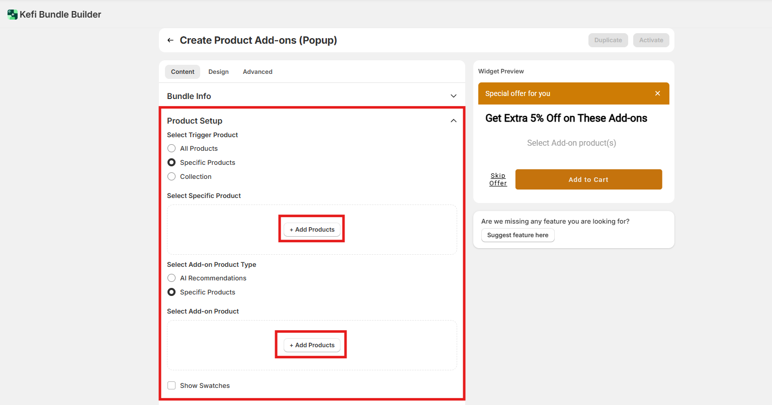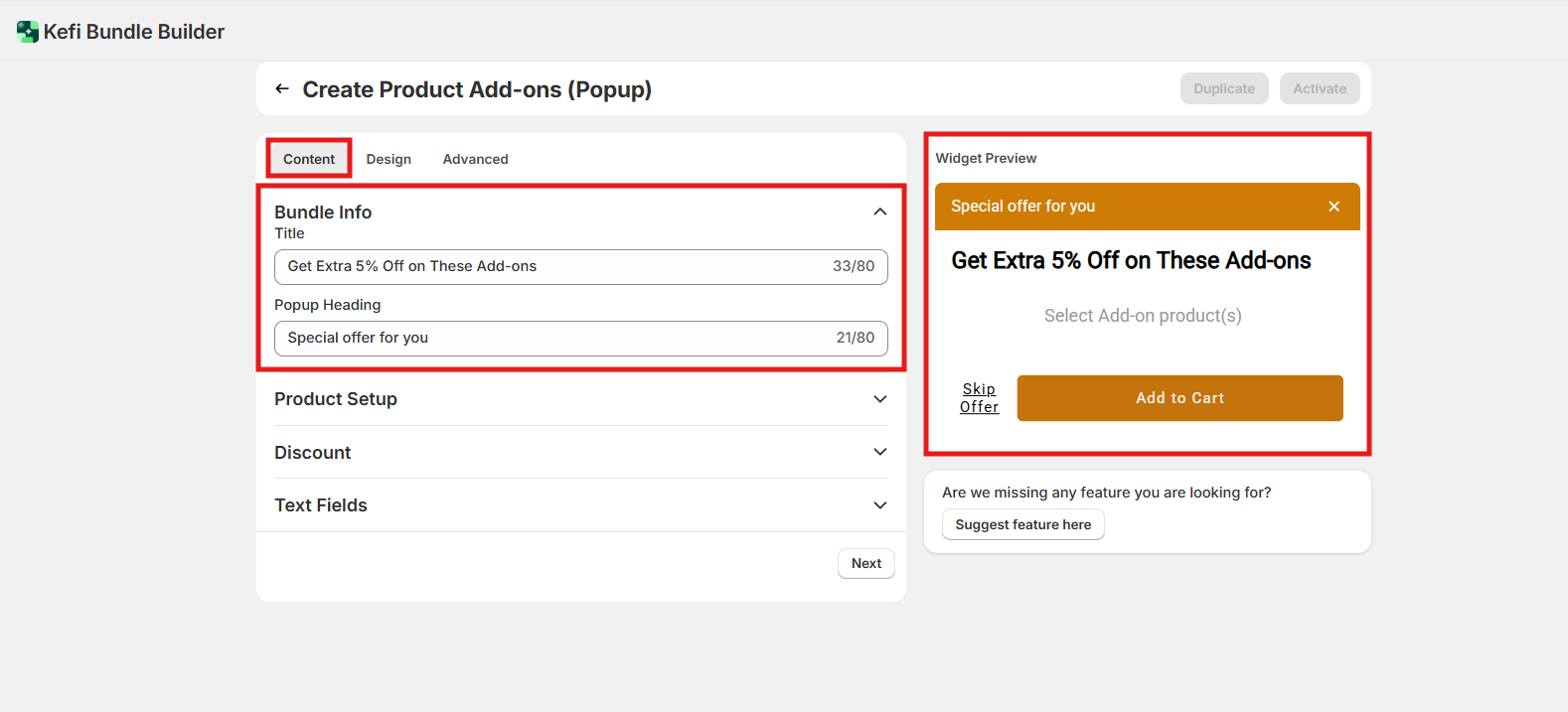 After you choose to create a Product Add-on (Popup), you'll be redirected to the Content section. This area is divided into four key sub-sections that help you customize how your bundle looks and works on your store: