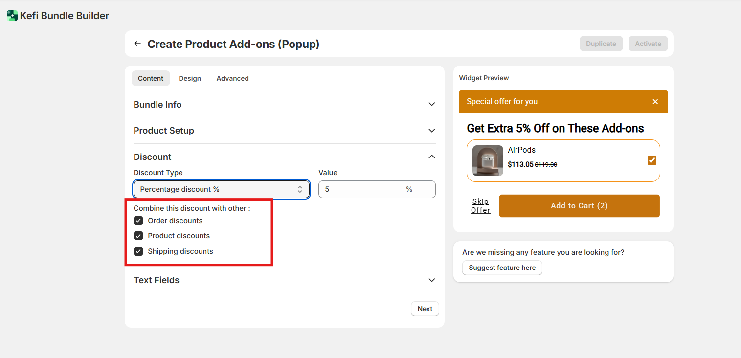 Percentage Discount – Apply a percentage-based discount (e.g., 5% off). Ideal for flexible, attractive offers that scale with the add-on product’s price.