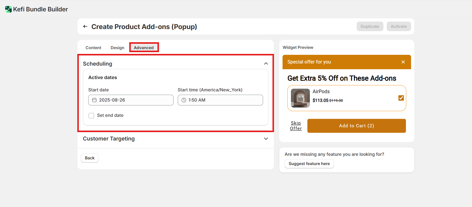 Set a start and end date for your bundle campaign. This is perfect for time-sensitive promotions, seasonal offers, or flash sales. The widget will only display during the defined period.