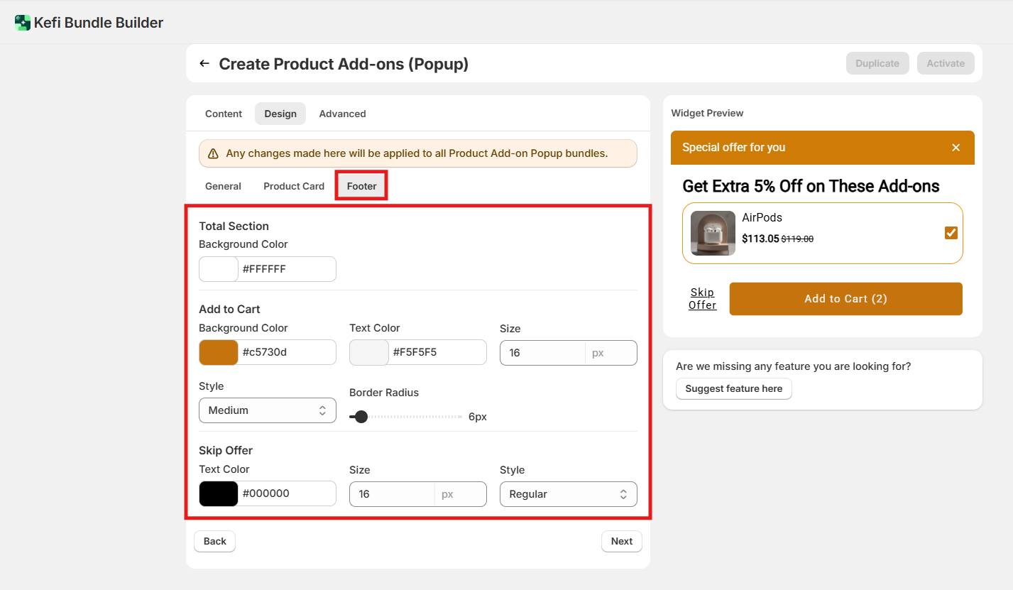 The Footer section allows you to style the bottom section of the bundle widget, including the pricing summary and action buttons.
