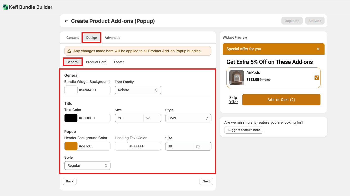 Design - The Design section allows you to tailor the visual appearance of your bundle widget, ensuring it aligns seamlessly with your store's branding and layout. You can customize everything from colors and fonts to image display and button styles. The design settings are organized into three main categories: