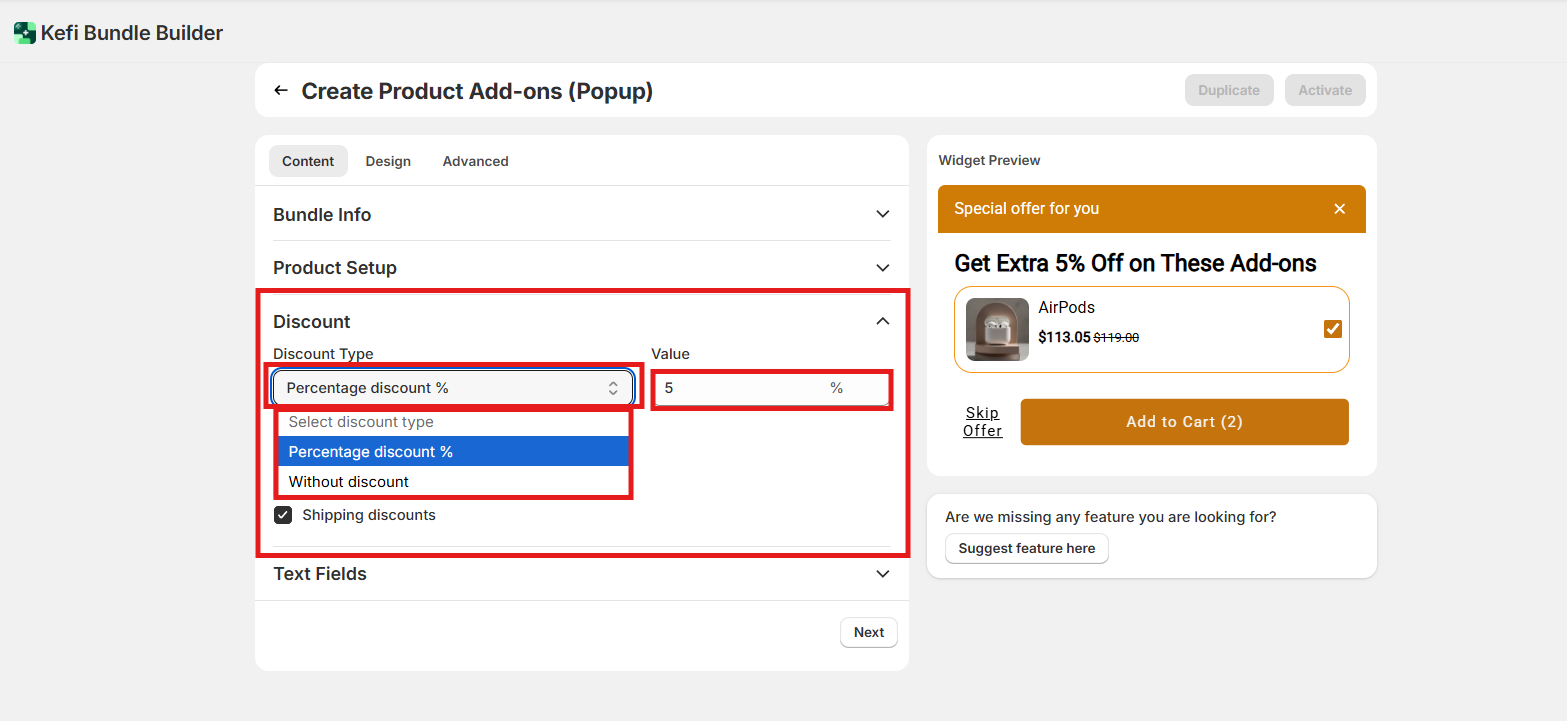 In this section, you’ll decide how you want to price the add-on product. There are two discount types available: