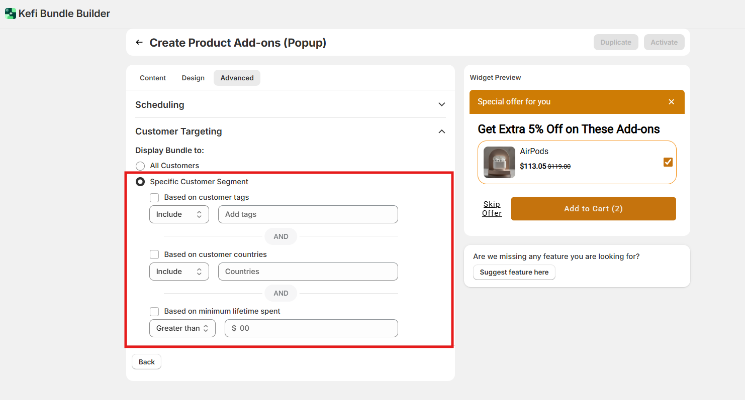 Minimum Lifetime Spend - Display bundles only to customers who’ve spent above or less than a set threshold.