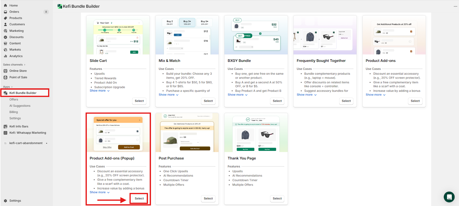 Go to the Kefi Bundle Builder homepage and select the Product Add-ons (Popup). Click “Select”