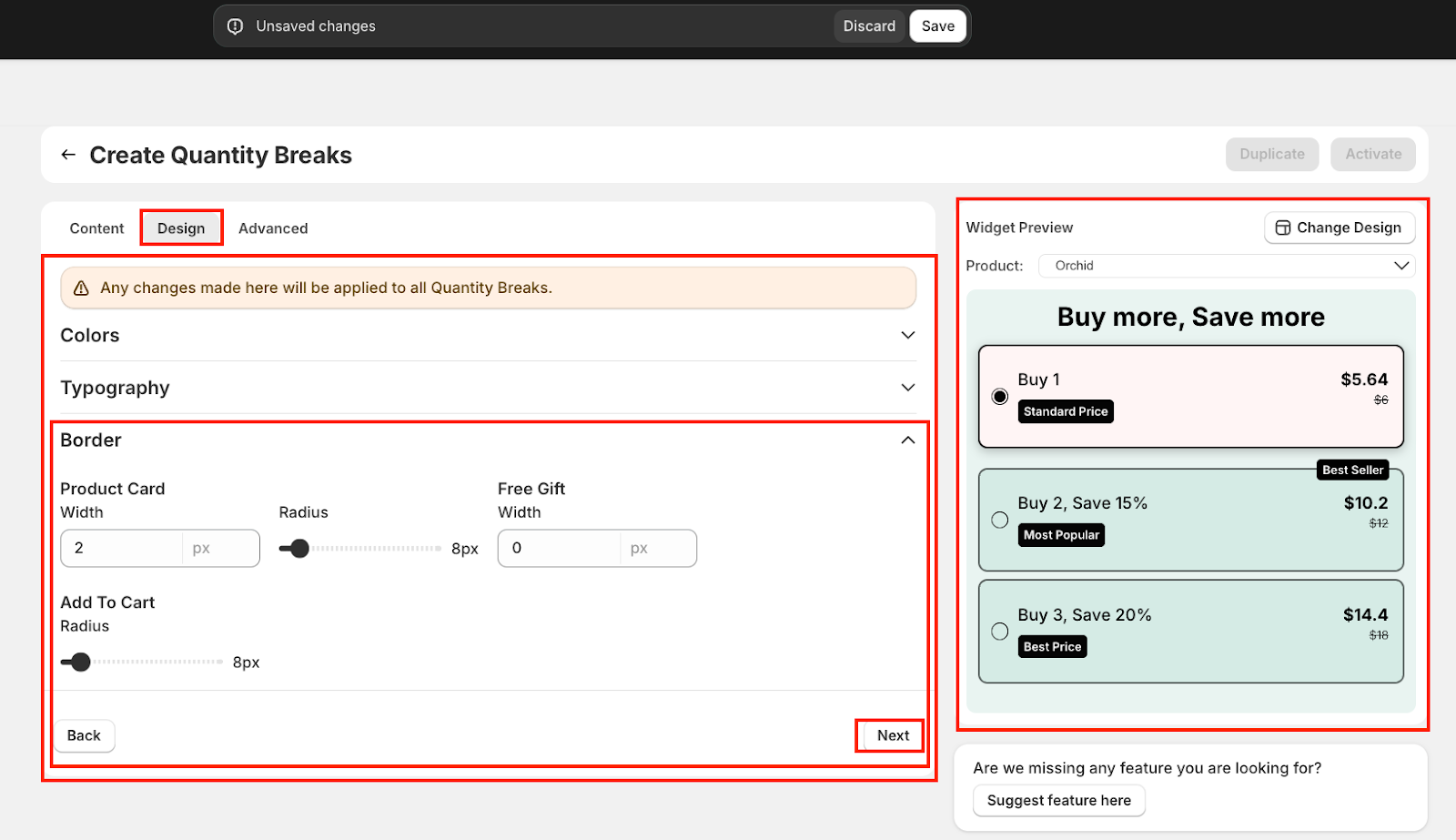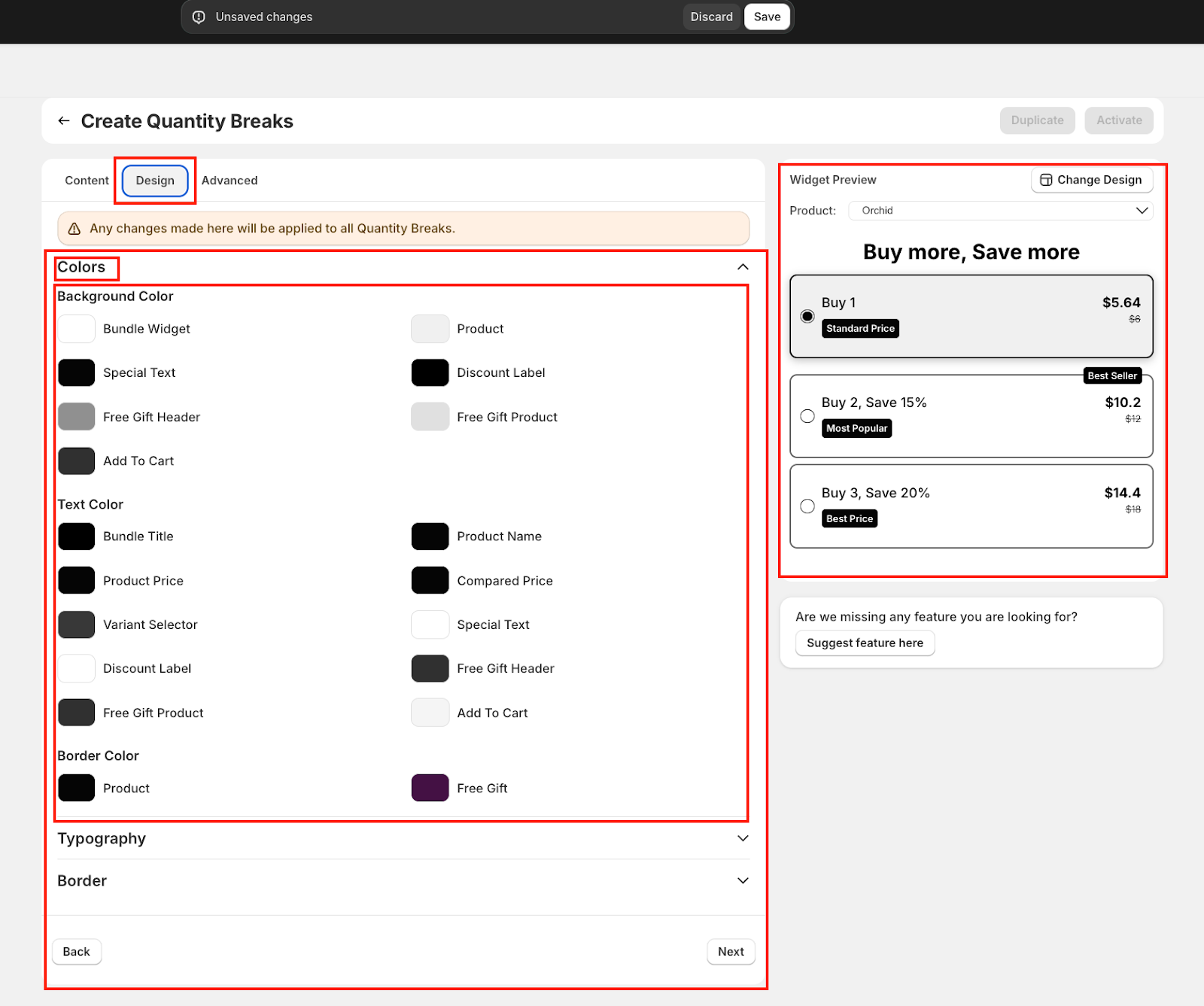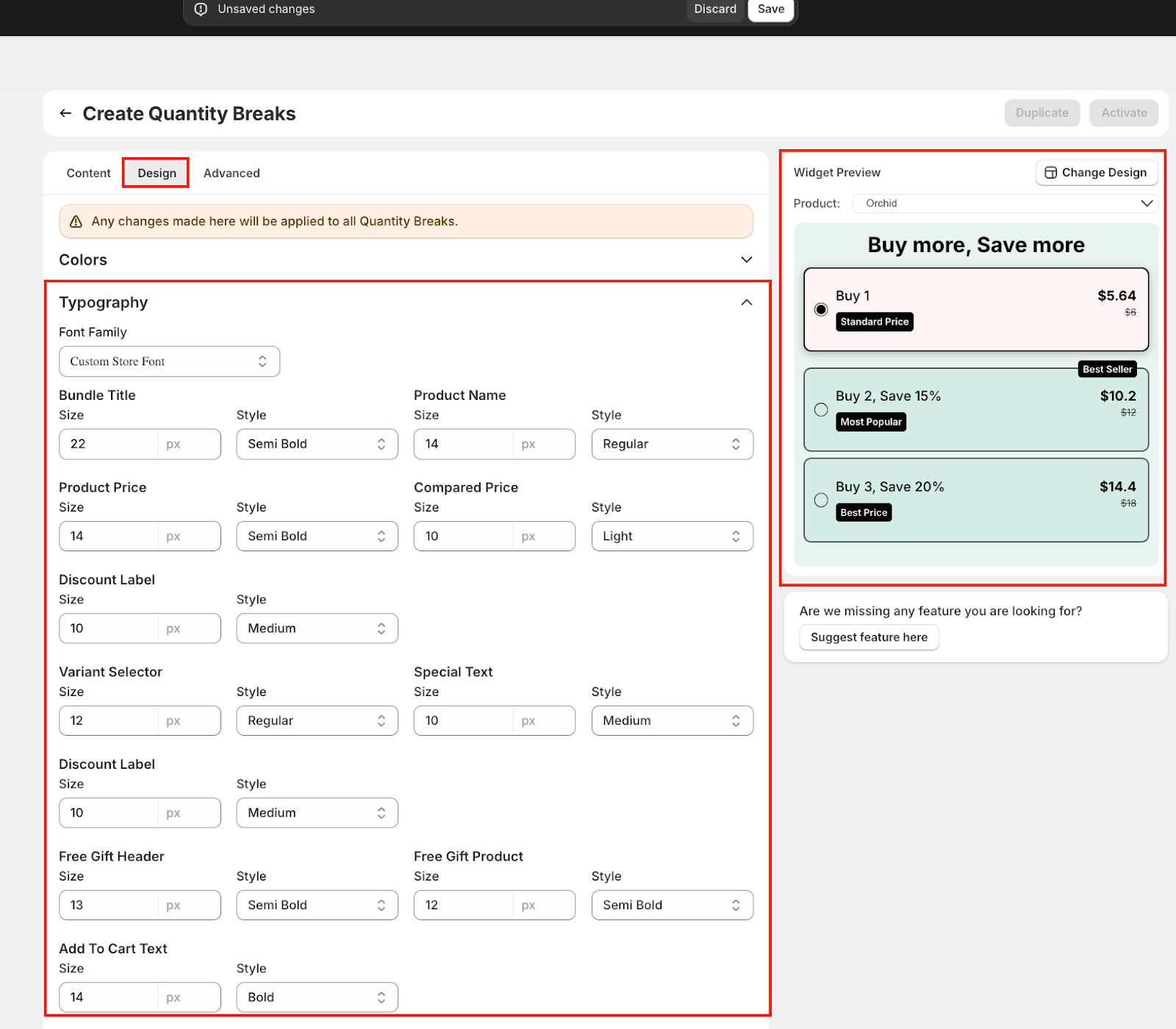 The Design tab allows you to personalize the visual appearance of all your Quantity Breaks offers to match your brand identity. Any changes made here will apply universally across all Quantity Breaks widgets in your store.