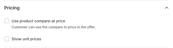 Show unit prices: Displays the price per unit (e.g., per item) to give customers more transparency, especially for bulk or volume-based offers.