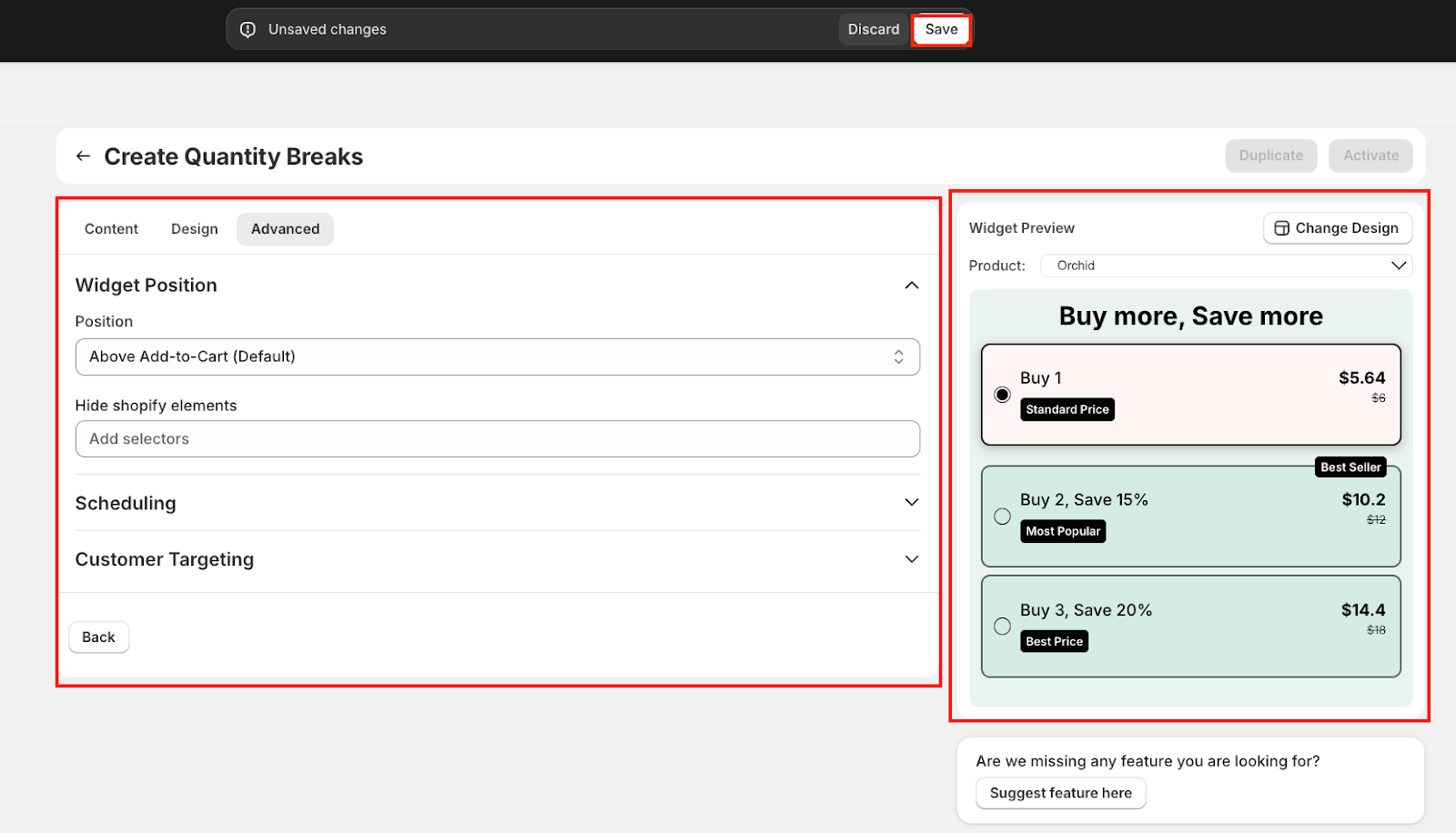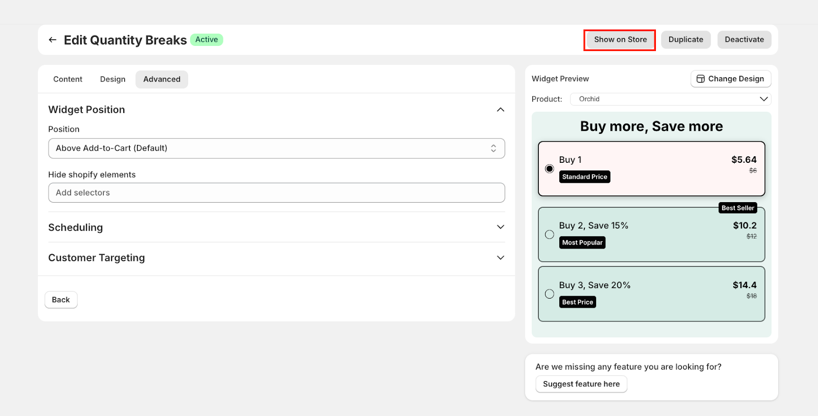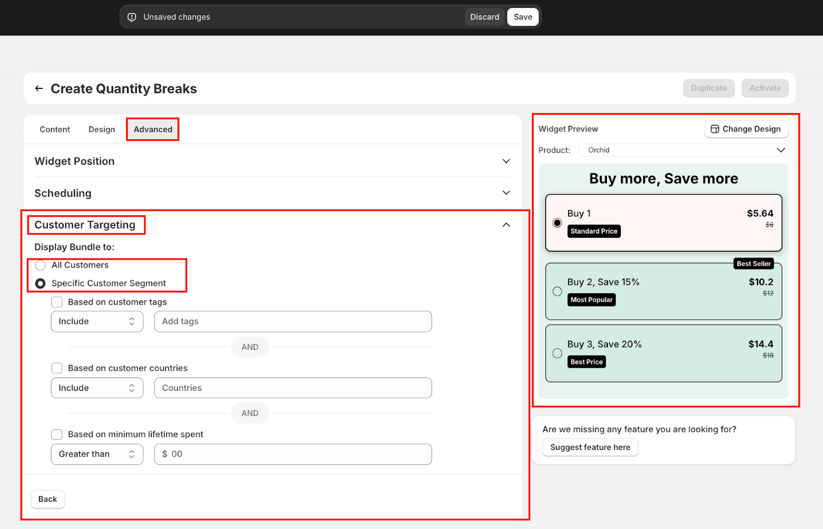 The Advanced tab gives you control over how, when, and to whom the Quantity Breaks widget appears. These settings help tailor the offer experience to match your store's layout and marketing strategy.