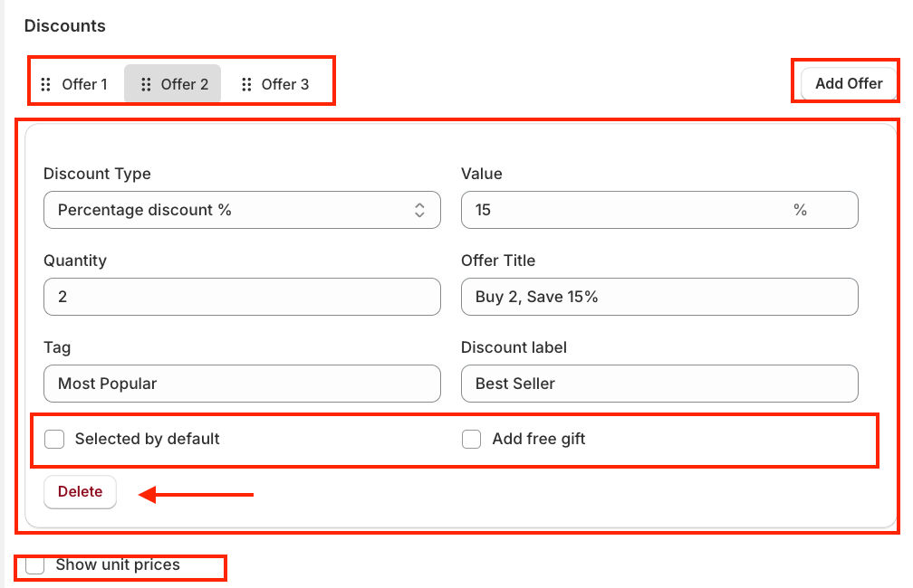 You can use "Add Offer" to create more discount tiers or click "Delete" to remove any.