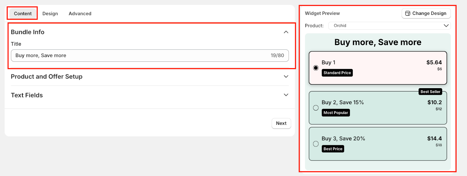 Once you're done customizing the text fields, click Next to proceed to the Design section of the bundle setup.