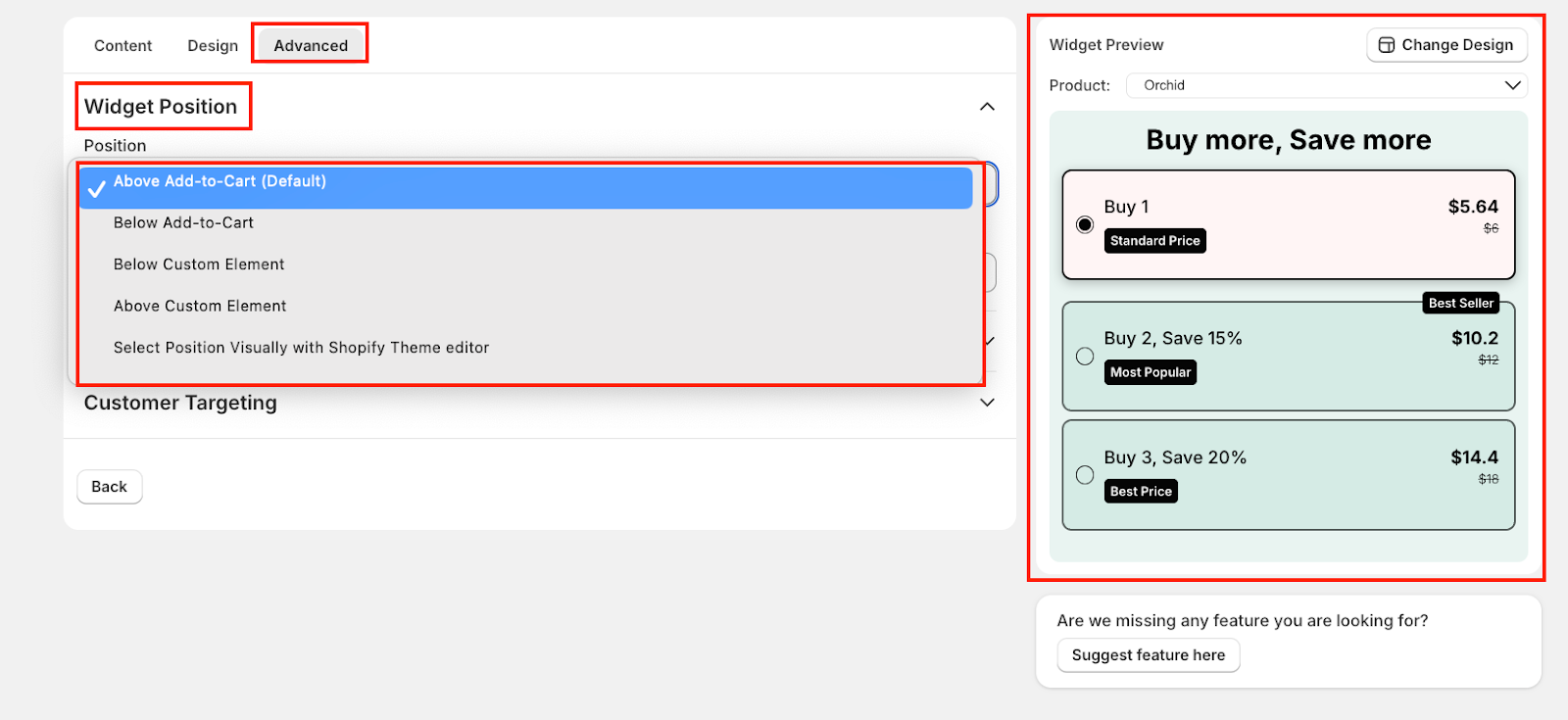 To make positioning easier, you can also select the widget's position visually using the Shopify Theme Editor—no coding needed.