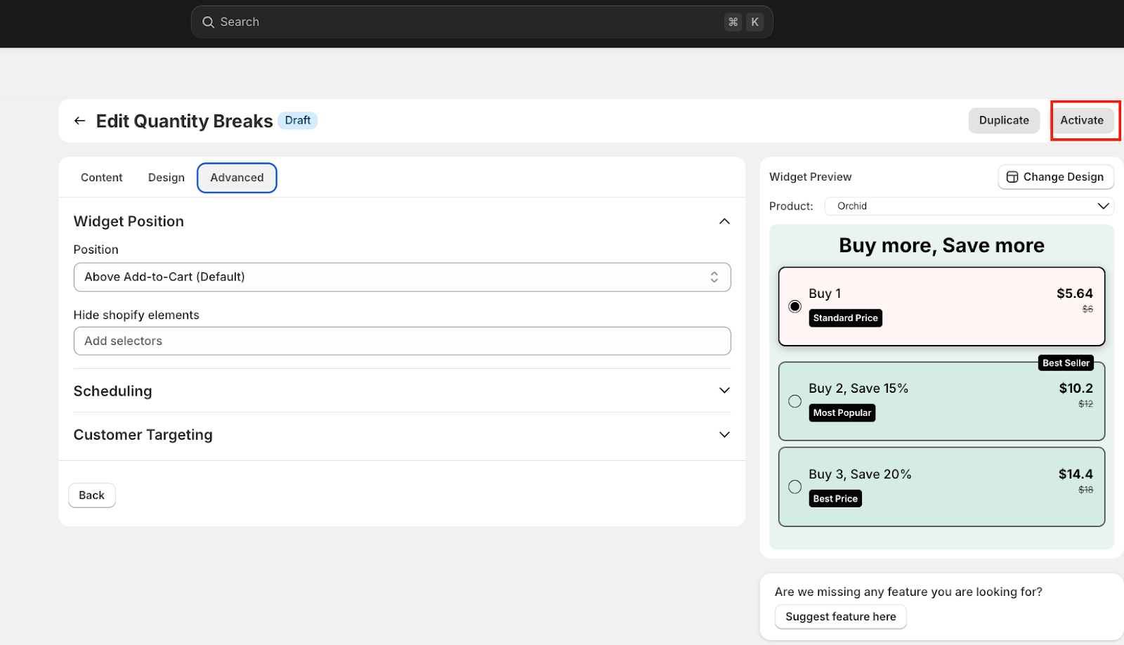 Finally, activate the Quantity Breaks/Volume Discount Bundle by simply clicking on ‘Activate’.