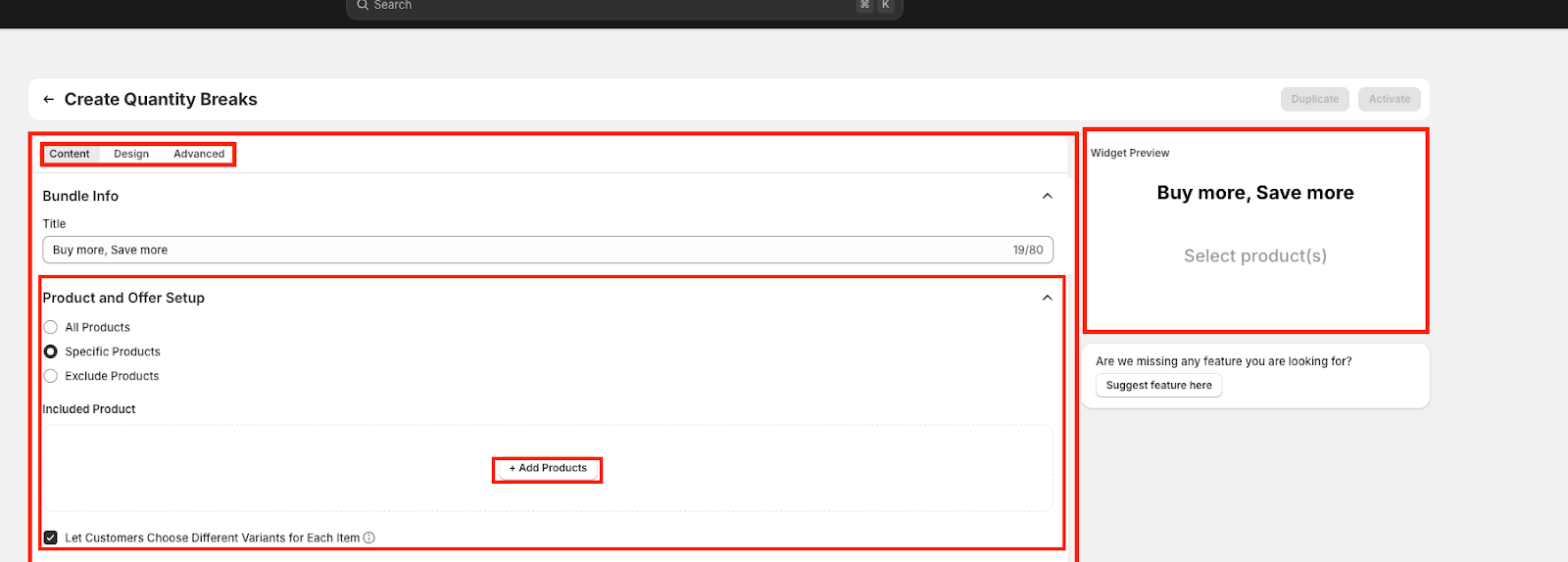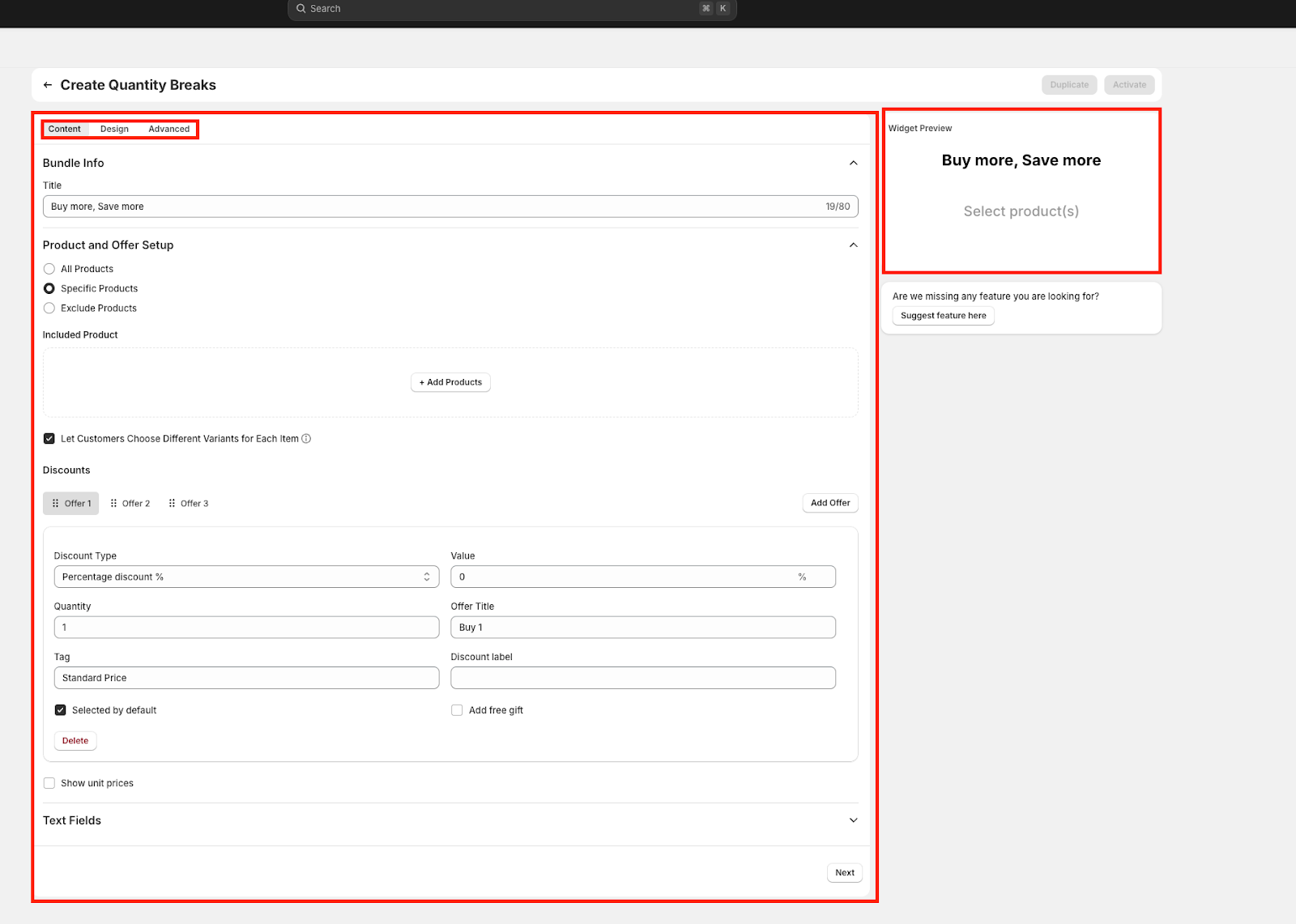 The Content tab is where you define the structure, logic, and messaging of your Quantity Breaks offer. This section allows you to set bundle titles, eligible products, discount tiers, and how offers are displayed to customers.
