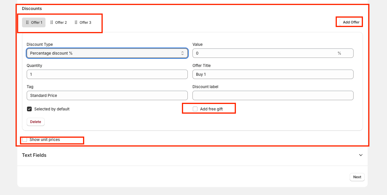 3. Discounts - Set multiple discount tiers using the tabs (Offer 1, Offer 2, Offer 3, etc.).