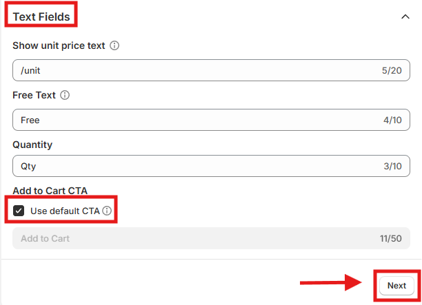 If the “Use default CTA” checkbox is selected, the standard “Add to Cart” label will be used. Unchecking it allows you to enter your own custom CTA.
