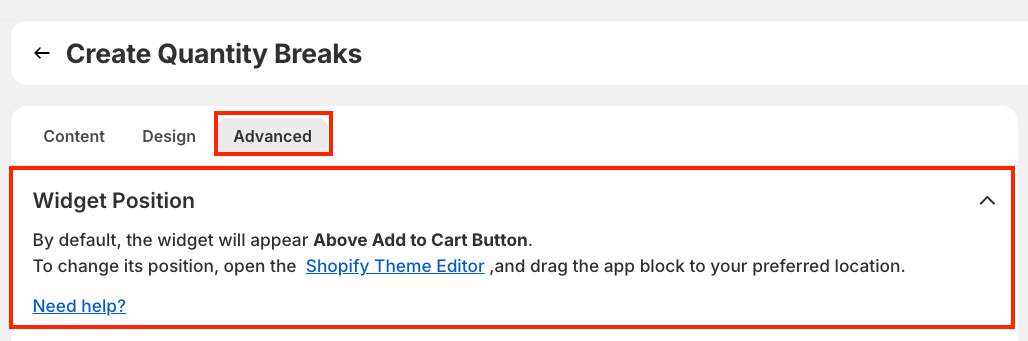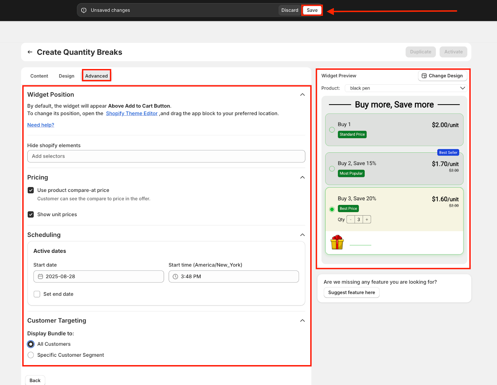The Advanced tab gives you more control over how your Quantity Breaks bundle is displayed, priced, and targeted to customers.