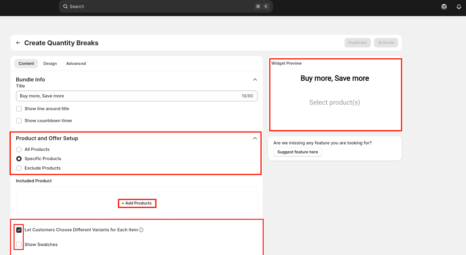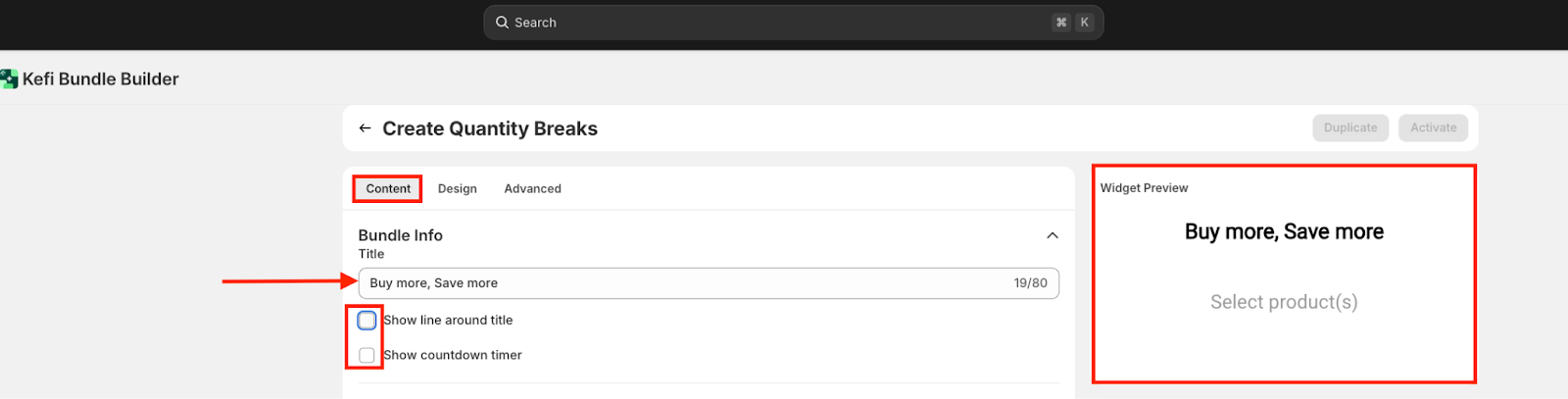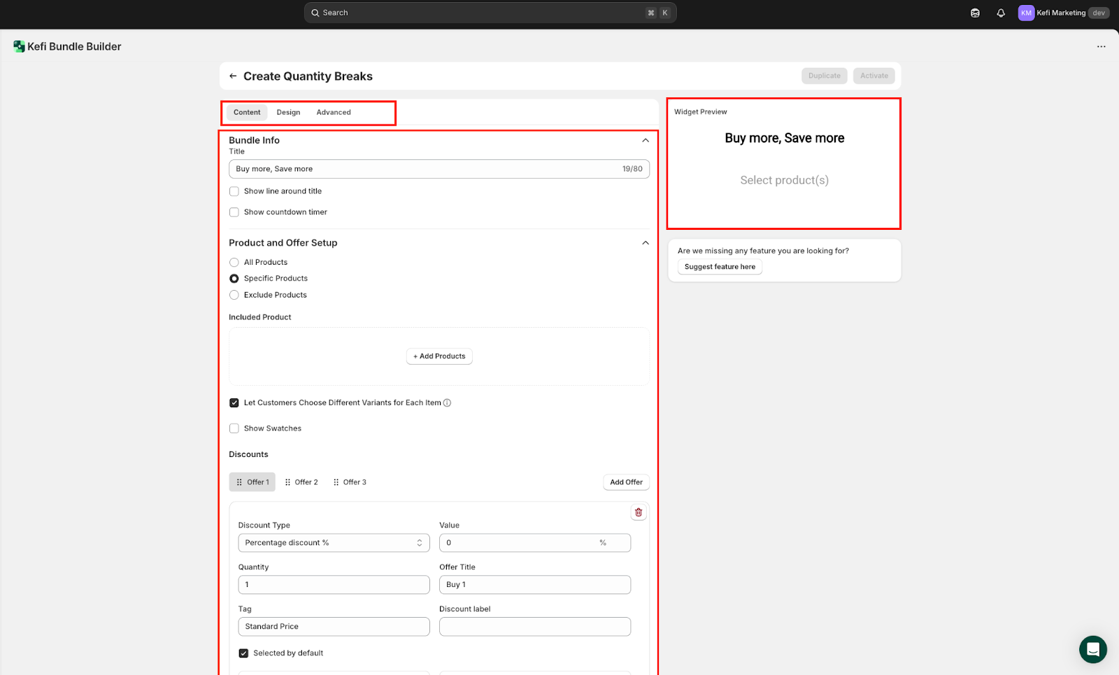 The Content tab is where you define the structure, logic, and messaging of your Quantity Breaks offer. This section allows you to set bundle titles, eligible products, discount tiers, and how offers are displayed to customers.